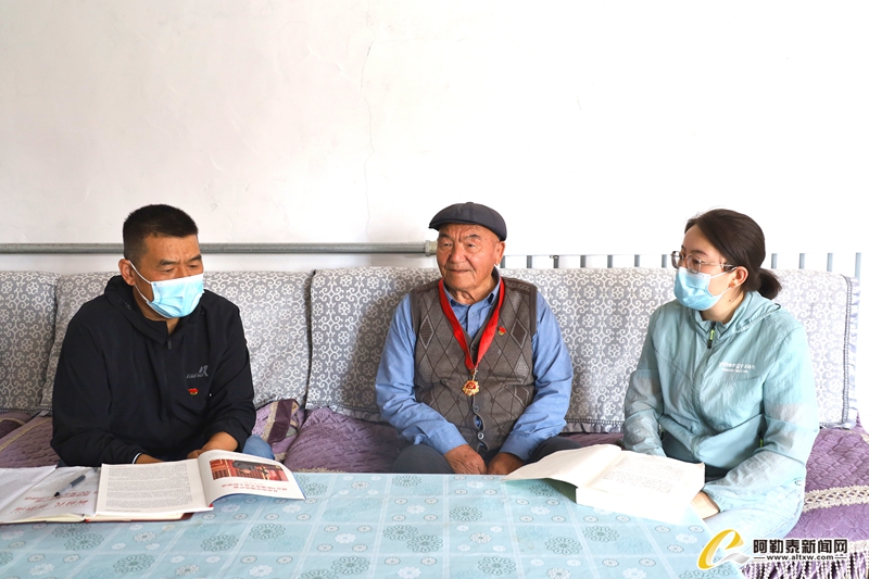 84岁高龄的老党员卡斯林·热木汗同志已有66年的党龄,是克孜勒托盖村唯一一名“光荣在党五十年勋章”获得者,在老人家中大家一起重温了入党誓词,共同学习了习近平总书记在庆祝中国共产党成立100周年大会上的讲话精神。卡斯林·热木汗说:“作为老党员我们应当更加同心同德,永远跟党走。”