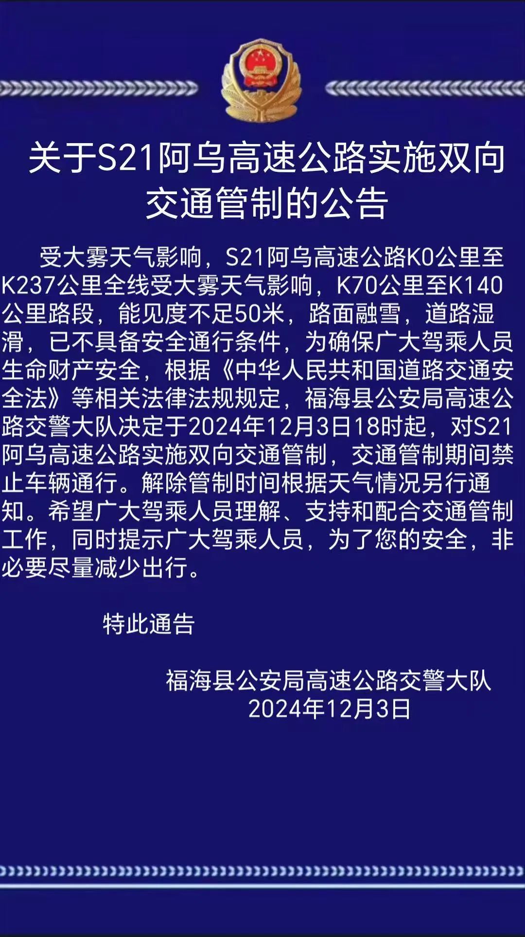 关于S21阿乌高速公路实施双向交通管制的公告