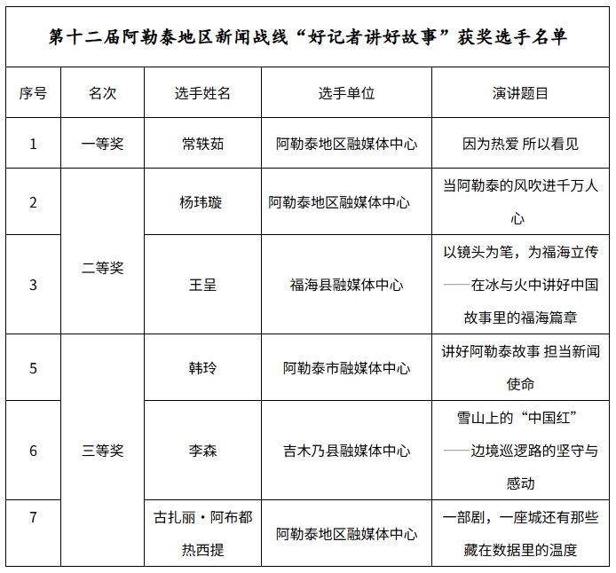 根据自治区新闻战线第十二届“好记者讲好故事”活动要求,阿勒泰地委宣传部于2025年7月21日在阿勒泰市举办第十二届阿勒泰地区新闻战线“好记者讲好故事”演讲比赛活动,阿勒泰地区融媒体中心、各县(市)融媒体中心派选手参加,现将参赛获奖选手名单公示如下: