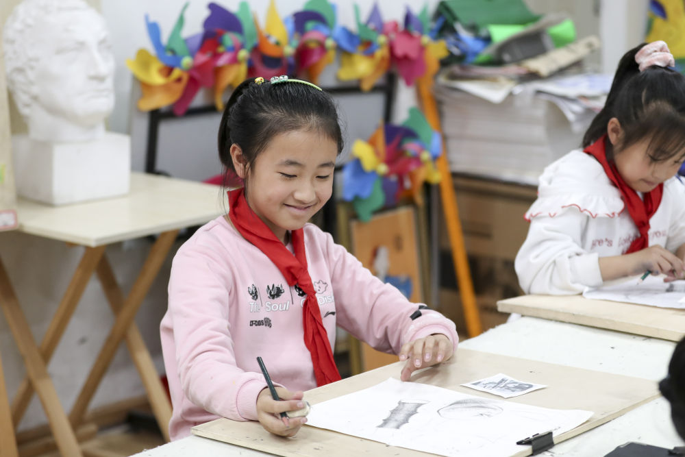 2021年10月27日,学生在黑龙江省哈尔滨市榆树镇中心校新乡小学乡村学校少年宫参加美术学习班。近年来,黑龙江省各地以乡村小学为基础,大力发展乡村学校少年宫,开设德育、文艺、体育、科普、手工等多种课外活动,满足学生需求,培养孩子们的兴趣爱好和特长。