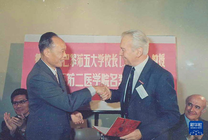 上海第二医学院(现上海交通大学医学院)校长王振义(前左)授予法国巴黎第五大学校长欧基埃名誉教授称号(摄于1985年)。新华社发(上海交通大学医学院供图)