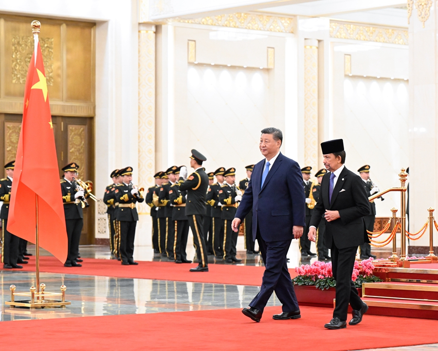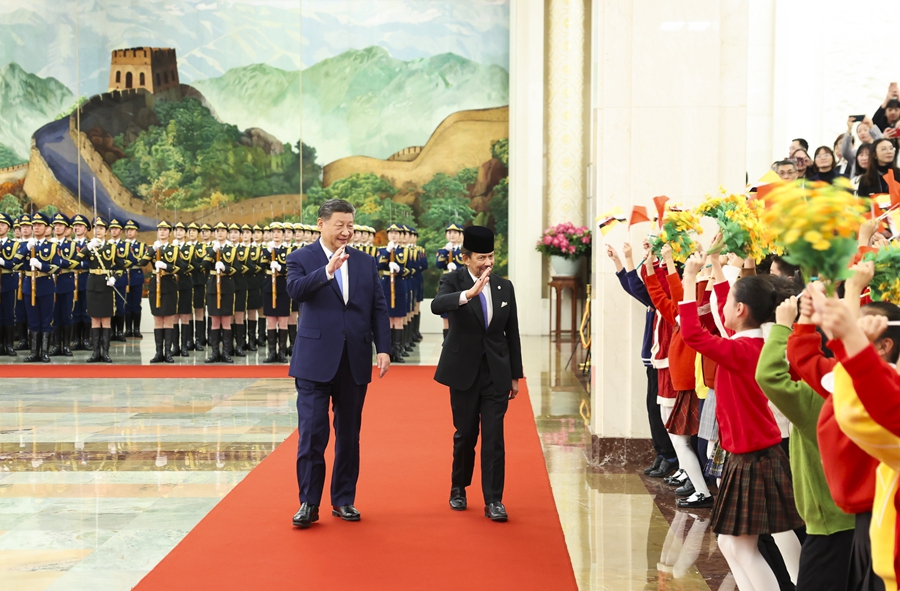 2月6日上午,国家主席习近平在北京人民大会堂同来华进行国事访问的文莱苏丹哈桑纳尔举行会谈。这是会谈前,习近平在人民大会堂北大厅为哈桑纳尔举行欢迎仪式。新华社记者 黄敬文 摄