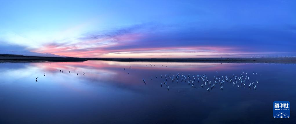 白鹭在甘肃省酒泉市阿克塞哈萨克族自治县冬不拉水库栖息觅食(2025年11月9日摄,无人机照片)。新华社发(高宏善 摄)