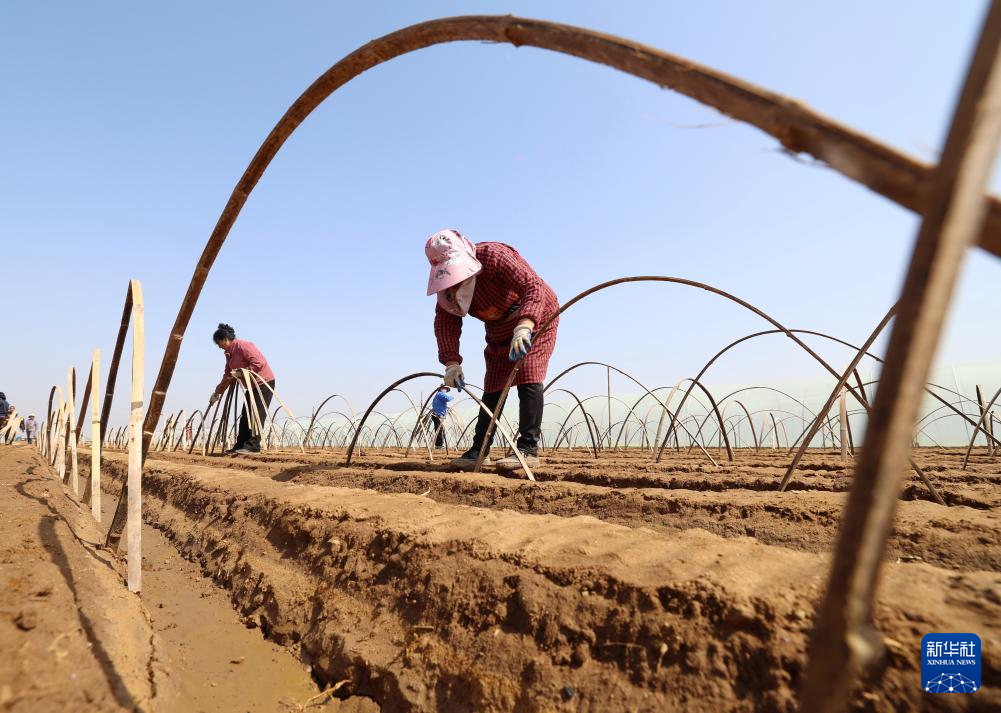 3月25日,河北省石家庄市行唐县南桥镇农民在田间搭建姜棚。新华社记者 杨世尧 摄