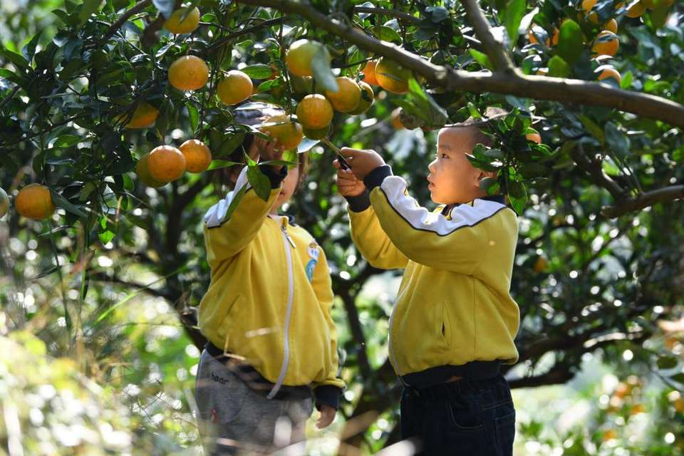 △贵州黄平县小朋友在校外劳动实践基地采摘柑橘。