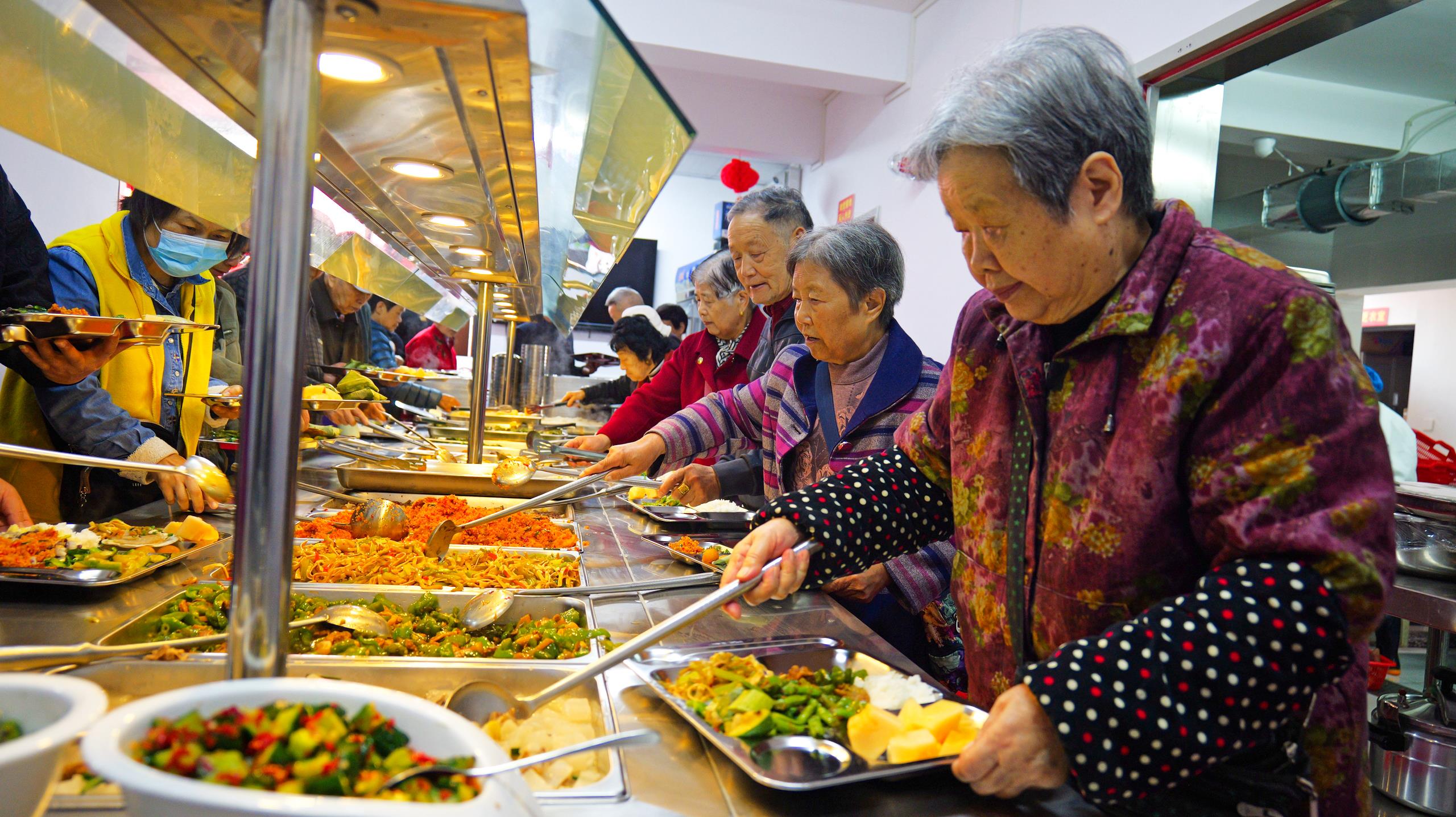 △湖北恩施一社区“幸福食堂”里,社区老人、退休职工在排队取餐。
