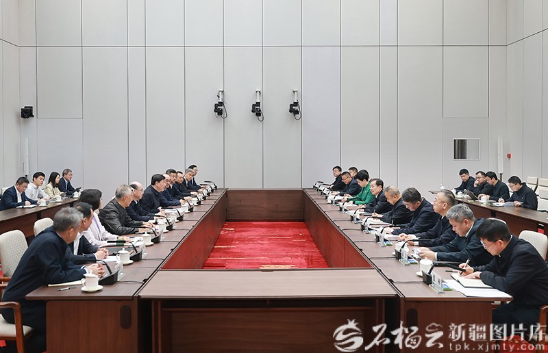 3月21日,自治区党委书记陈小江、自治区主席艾尔肯·吐尼亚孜在中国石油天然气集团有限公司与中国石油董事长戴厚良、总经理周心怀交流座谈。天山网-新疆日报记者 崔志坚摄