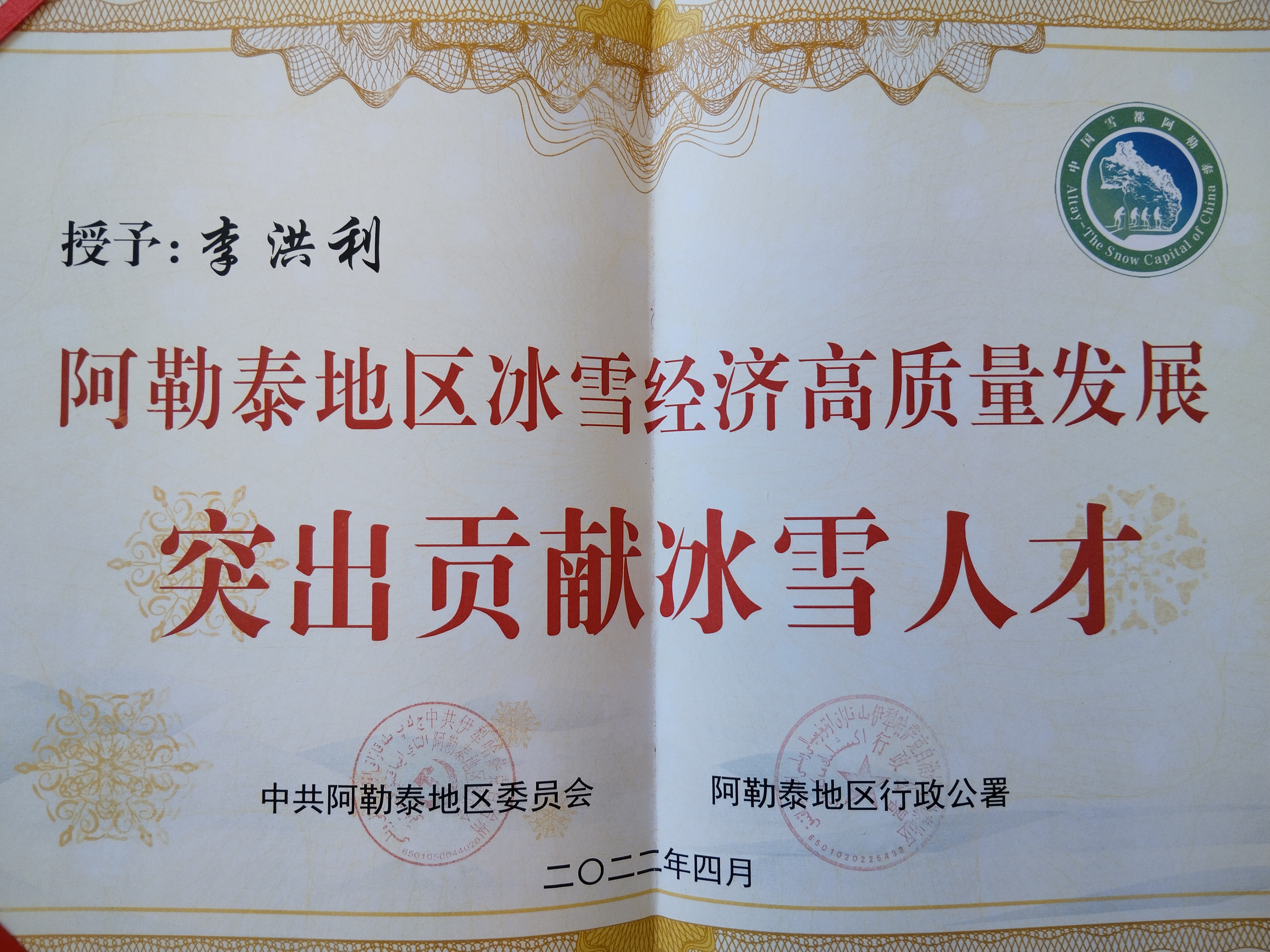 “回顾援疆工作,虽然有困难、有挑战,但也有收获。被地委、行署表彰为‘阿勒泰地区冰雪经济高质量发展突出贡献冰雪人才’,让我备受感动和鼓舞,也更加坚定了我在这片土地上继续发光发热的信心和决心。我相信,新疆的冰雪运动将会迎来更加美好的明天。”李洪利说。