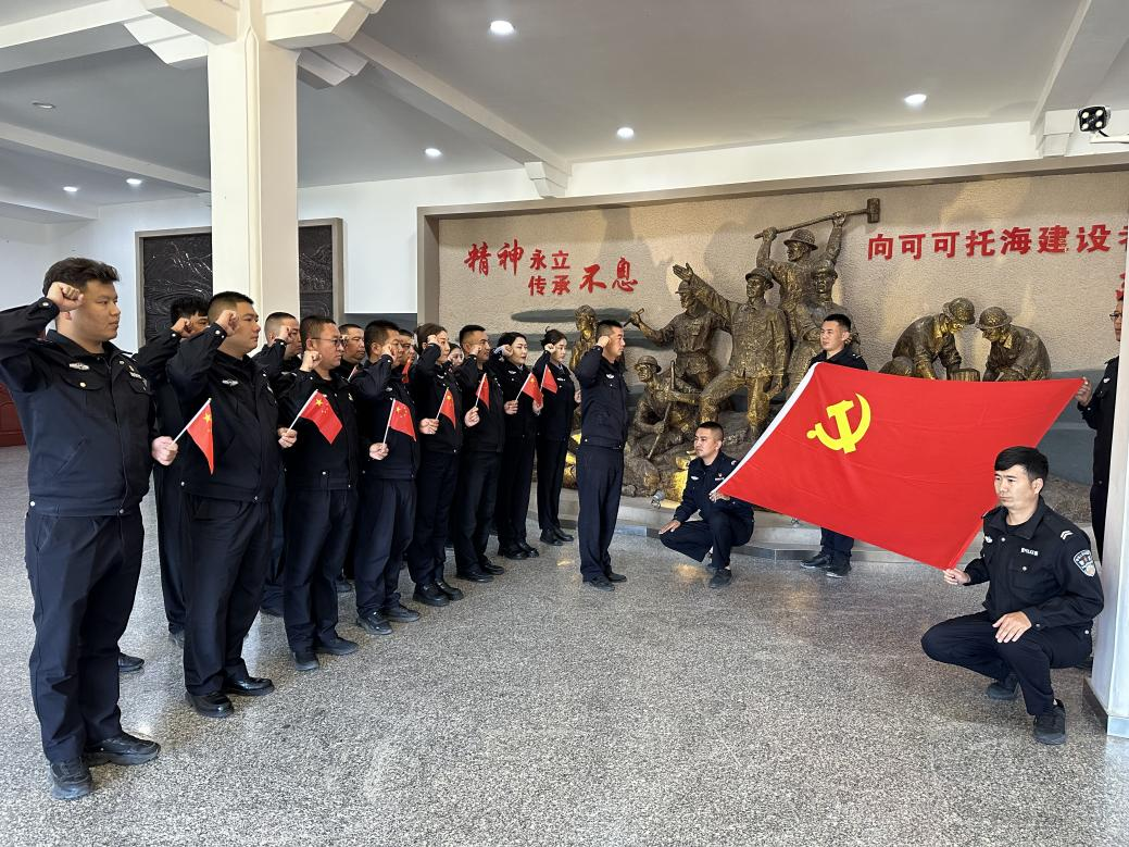 “我志愿加入中国共产党,拥护党的纲领,遵守党的章程……”党员民辅警面对鲜红的党旗,高举右拳,庄严宣誓。大家用铿锵誓言表达对党忠诚、永葆本色、铸牢忠诚警魂的坚定决心。