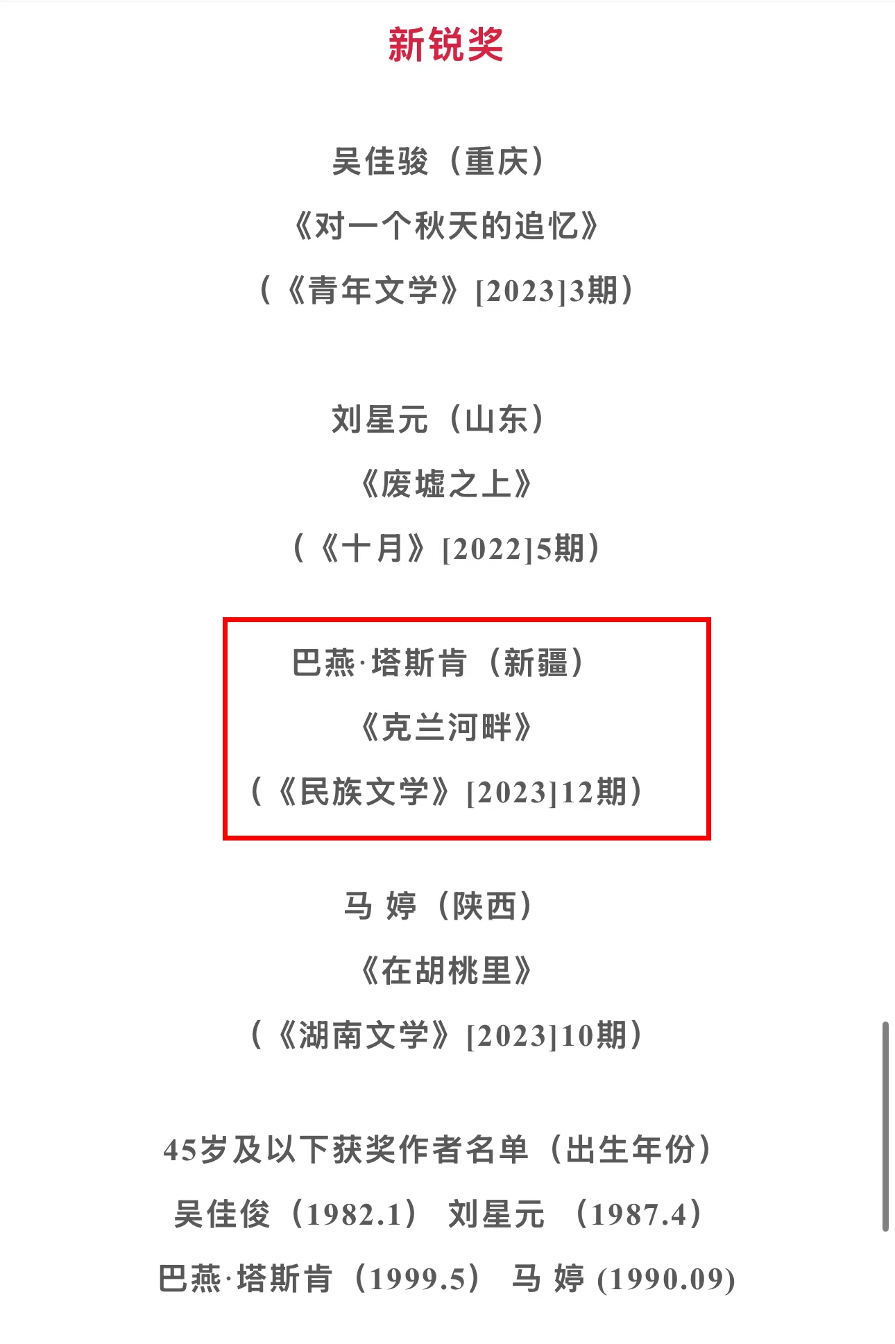 1月5日,第五届三毛散文奖获奖作品公示,阿勒泰市青年作家巴燕·塔斯肯凭借作品《克兰河畔》荣获第五届三毛散文奖单篇散文新锐奖。