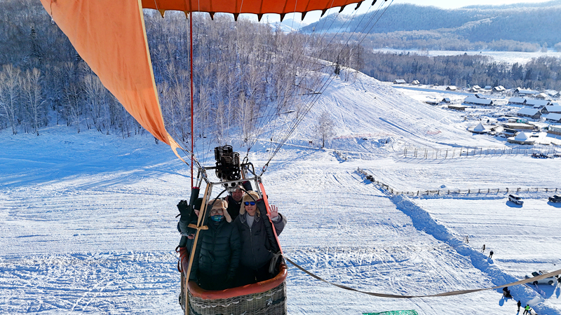 飞行测试无问题后,经验丰富的热气球驾乘人员向游客们详细讲解了热气球飞行的相关安全知识以及需要遵守的注意事项,引导游客们有序进入吊篮内,并按照既定操作启动充气装置,载着游客缓缓升到禾木村洪巴斯上空。从空中俯瞰下去,体验者不仅欣赏到了禾木冬季的壮丽景色,还为旅行增添了难忘的多彩体验。