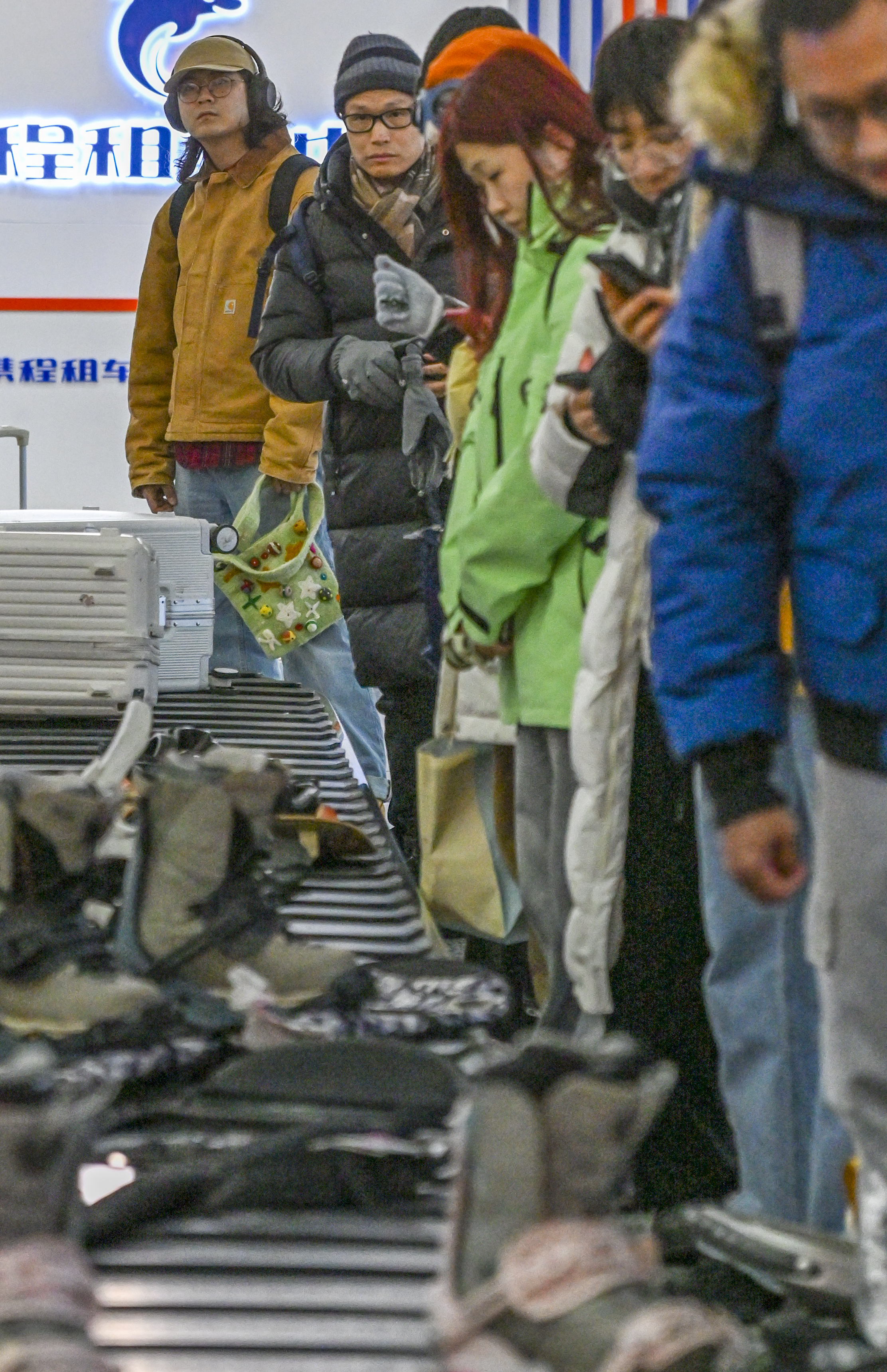 1月25日,在阿勒泰雪都机场行李提取大厅,游客等待提取行李。 新华社记者 陈朔 摄