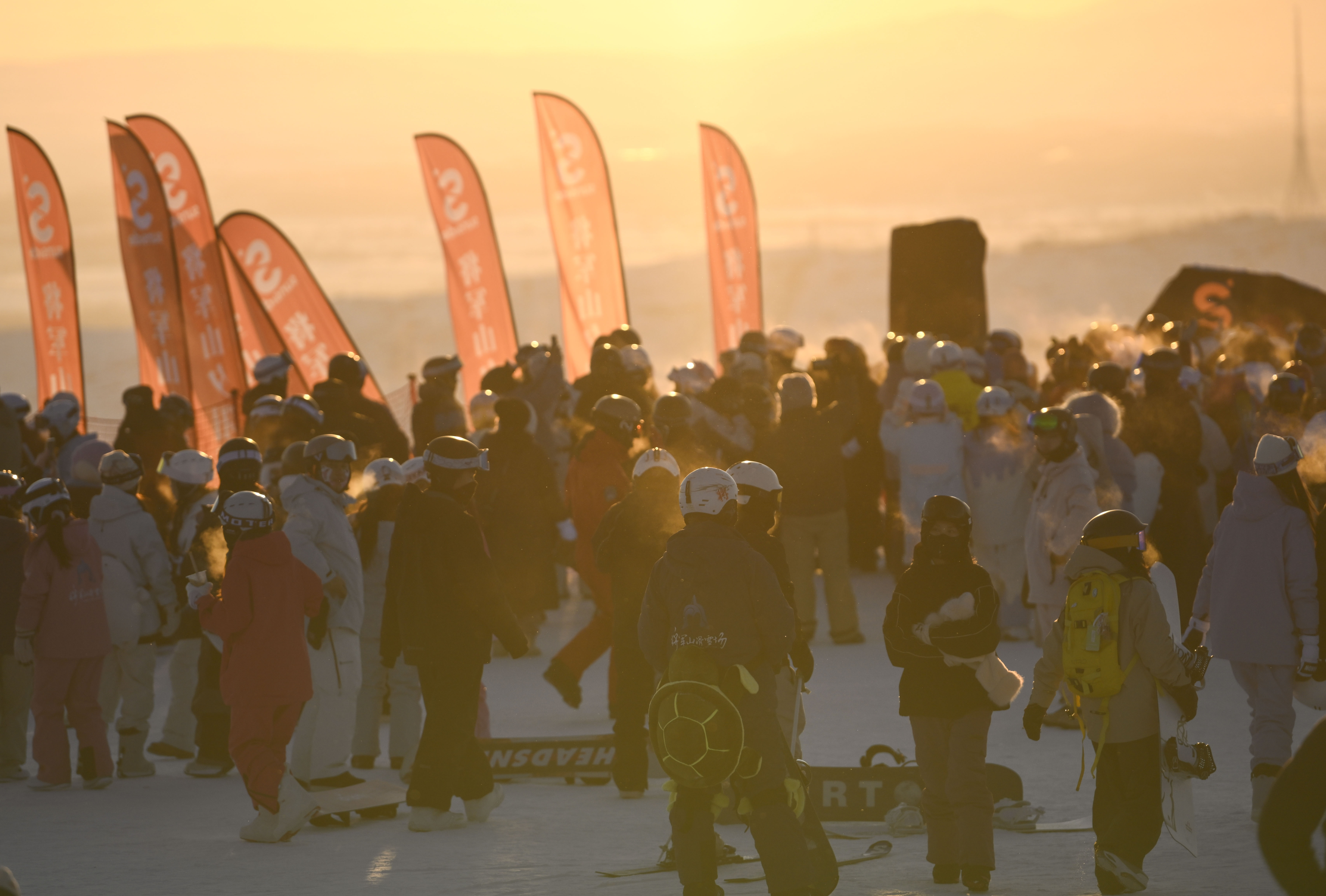 日落时分,阿勒泰市将军山国际滑雪度假区的山顶区域人头攒动(1月24日摄)。 新华社记者 胡虎虎 摄