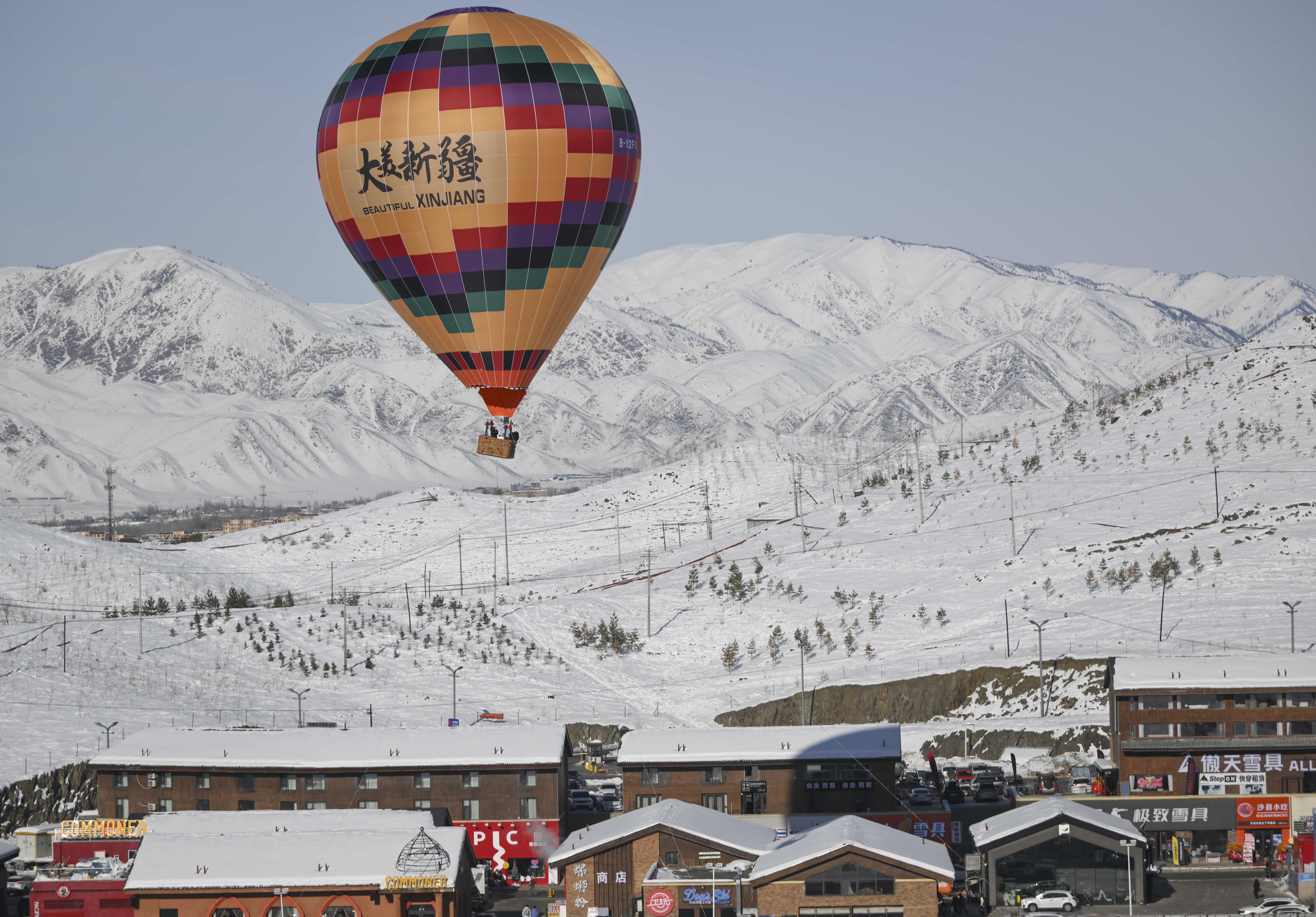 1月25日,游客在将军山国际滑雪度假区乘坐热气球观光。 新华社记者 胡虎虎 摄