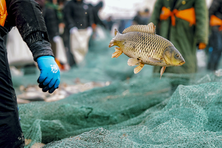 出网口旁,先是狗鱼,之后是体形较大的鲢鱼、鲤鱼……一条条鲜活的鱼从冰洞中随着渔网跃出冰面,渔工抱起一条条鱼抛在冰上,供天南海北的游客挑选。