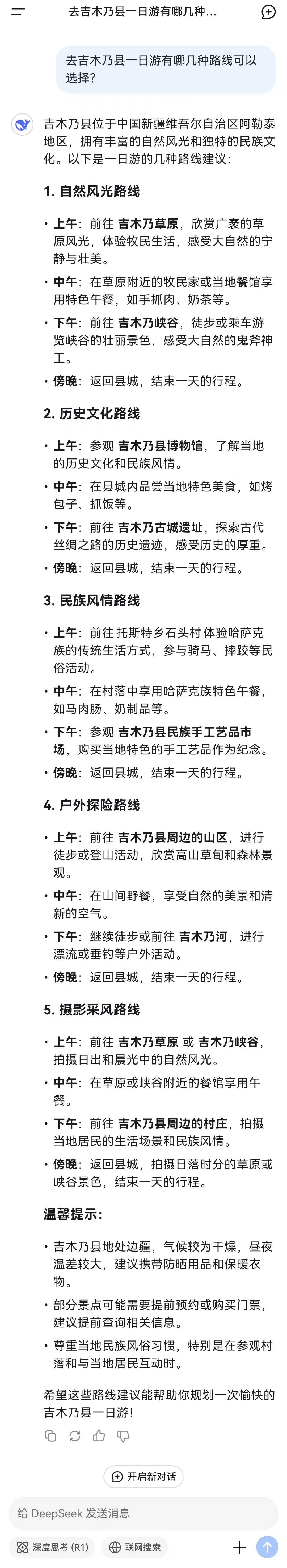 deepseek从历史文化、自然风光等不同的维度给予了观光者不同的路线选择。涵盖了吉木乃草原石城、峡谷、通天洞遗址等不同的吉木乃标志性景点,有没有你动的路线或打卡点?趁着周末,走一趟吧~