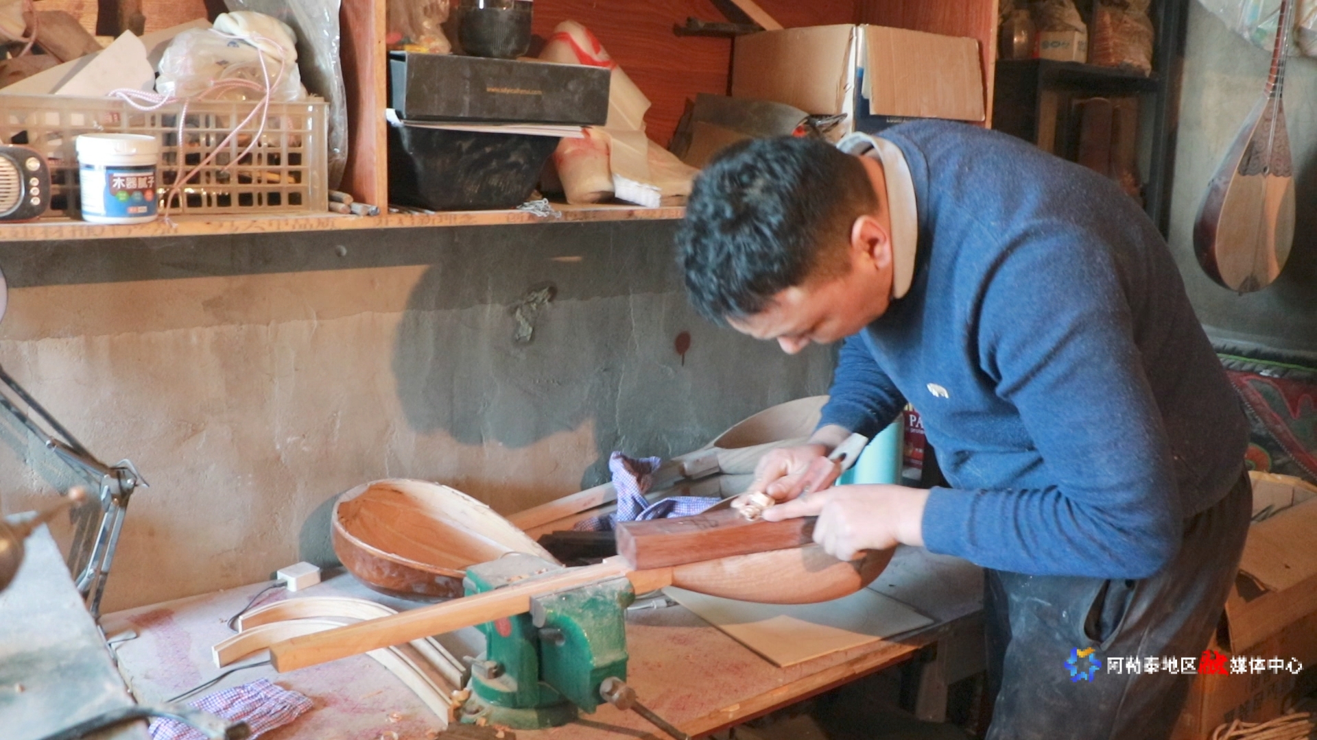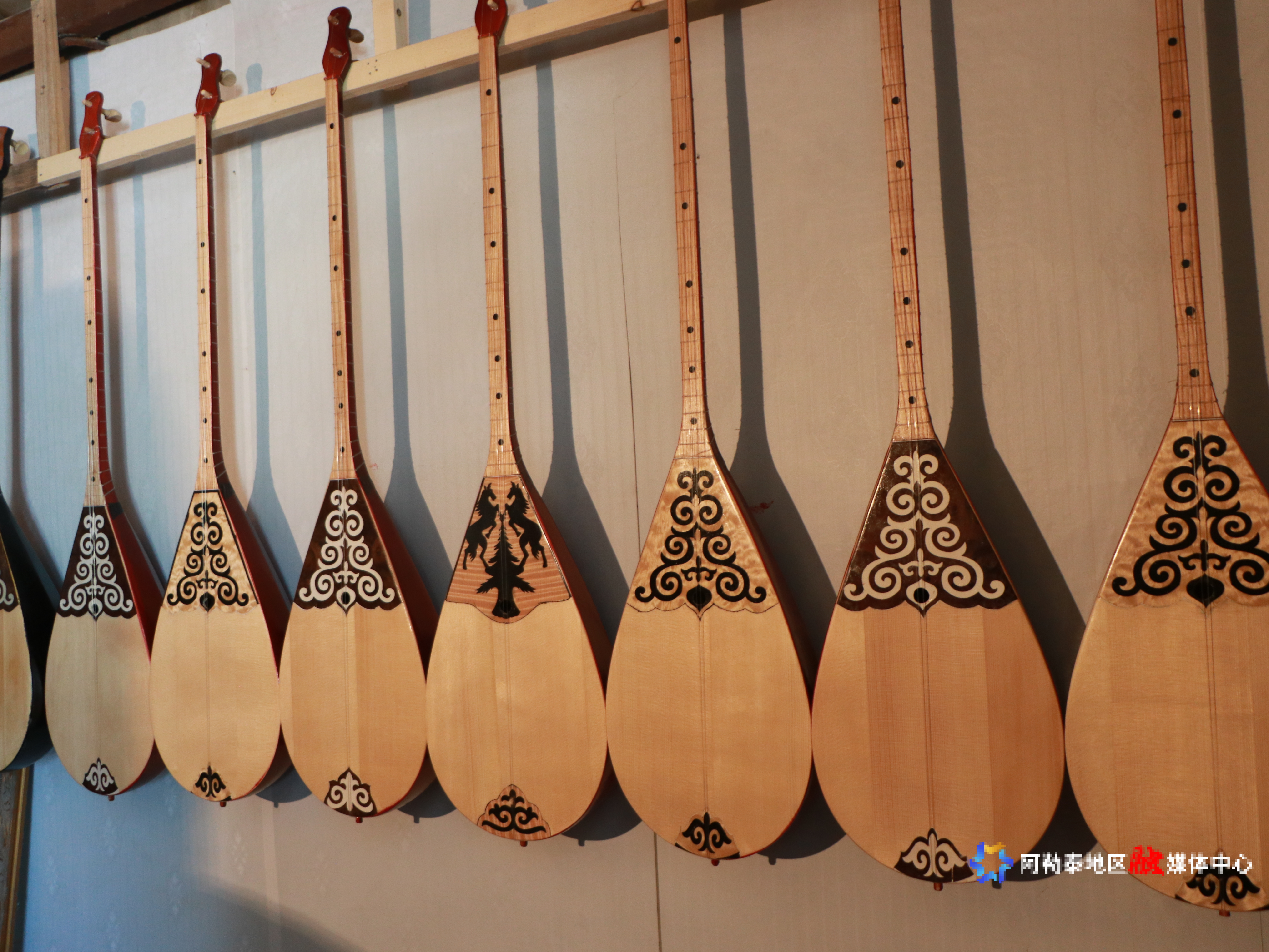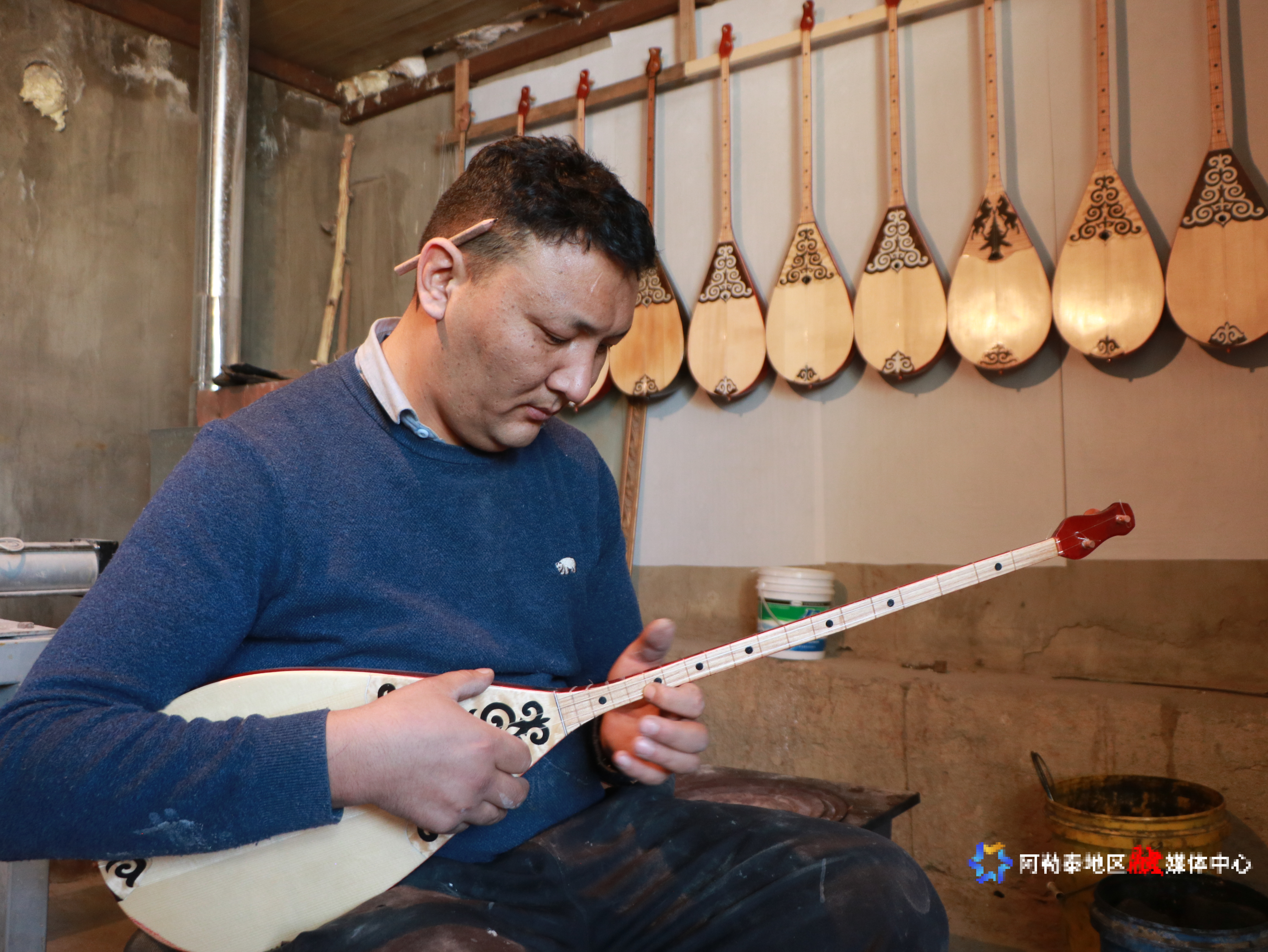 说干就干!巴合提别克·库曼开始跟着师傅学习冬不拉制作。可这门手艺并不简单,从选材、切割到烘烤、粘合,再到打磨、雕刻、上色、晾干,一共19道工序,每一步都需要耐心和细心。师傅忙时,他就自己琢磨,每天在工作室里一待就是十几个小时。“那时候,我满脑子都是冬不拉,怎么选材、怎么切割才能让音色更好,我不断地尝试。”巴合提别克·库曼回忆道。
