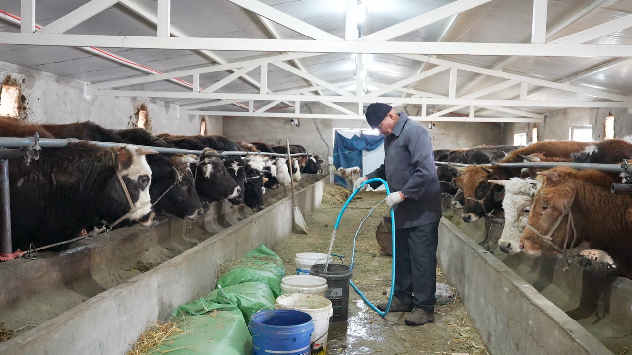 养殖户胡安别克·吐尔森说:“往年我的牲畜养在别斯铁热克乡,需要天天往返乡里喂牛喂羊,来回路费花销太大。现在县上给我们弄的集体养殖小区,水、电各方面都很齐全,真的很方便。