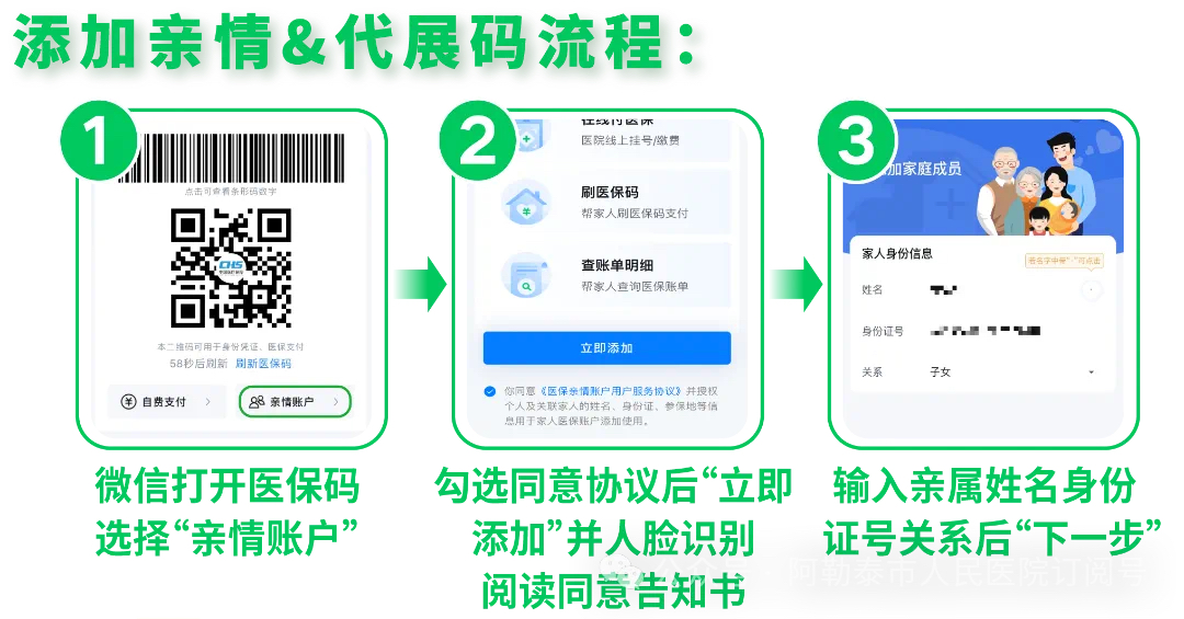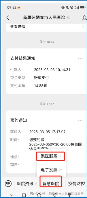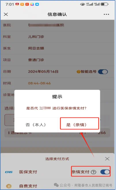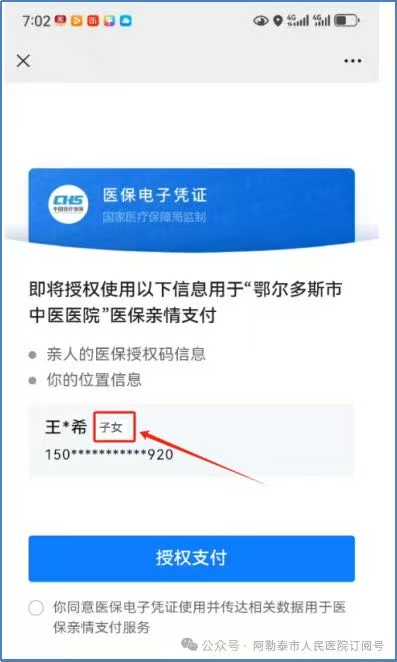 关注“阿勒泰市人民医院”公众号,选择智慧医院—就医服务,医生开具医嘱后,选择快速缴费,使用医保支付(亲情支付)。