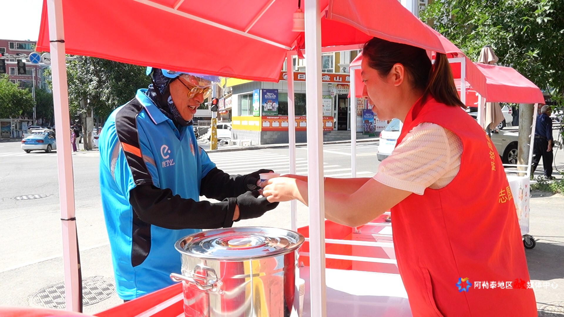 活动筹备阶段,社区工作人员精心挑选优质绿豆、新鲜西瓜等物资。大家分工协作,有人熬煮清香绿豆汤,有人切配甘甜西瓜。补给站红色帐篷下,“为户外工作者免费供应绿豆汤、冰镇西瓜”的横幅格外醒目,让人倍感温馨。