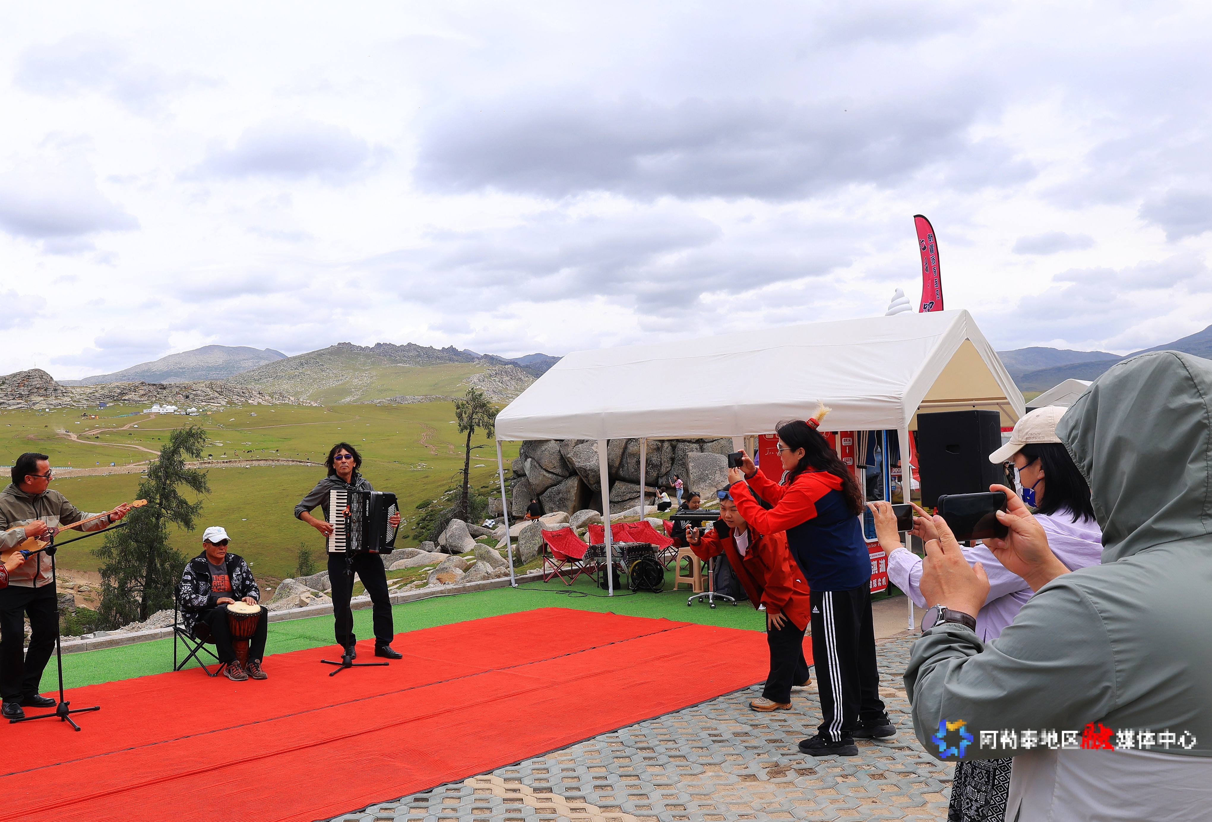 在乌希里克草原,阿勒泰市红墩镇公共文化服务中心的工作人员为大家带来了欢快的表演,欢乐的氛围吸引了山东游客尹作平的加入。“我是一名音乐爱好者,平时都是自己玩。没想到一路开车到阿禾公路,碰到文艺工作者在即兴表演,他们的音乐和歌声打动了我。我立刻从车里带上我随身带的非洲鼓跟他们合奏一曲,非常尽兴!有这么好看的天地为舞台,我感觉这是听到的最舒服的一次演奏。”