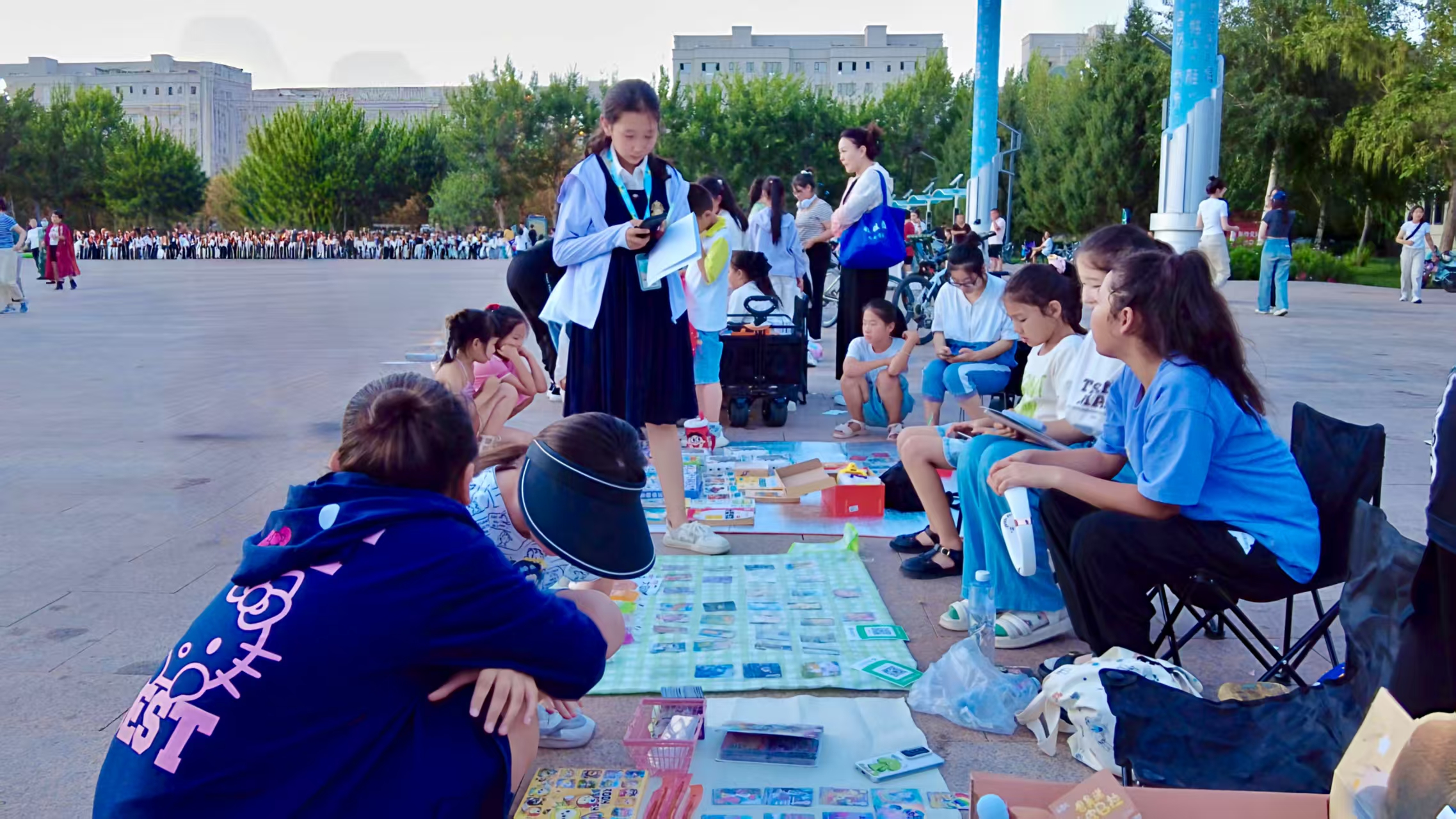 “打折了 打折了”“快来买哟!”“买东西送一张小卡哟”……暑假期间,福海县委广场摇身一变,成为充满童趣的“露天市集”,孩子们带着闲置玩具、书籍自发摆摊售卖,此起彼伏的叫卖声与五彩摊位相互映衬,绘就了城市夏日里独特又鲜活的风景线。