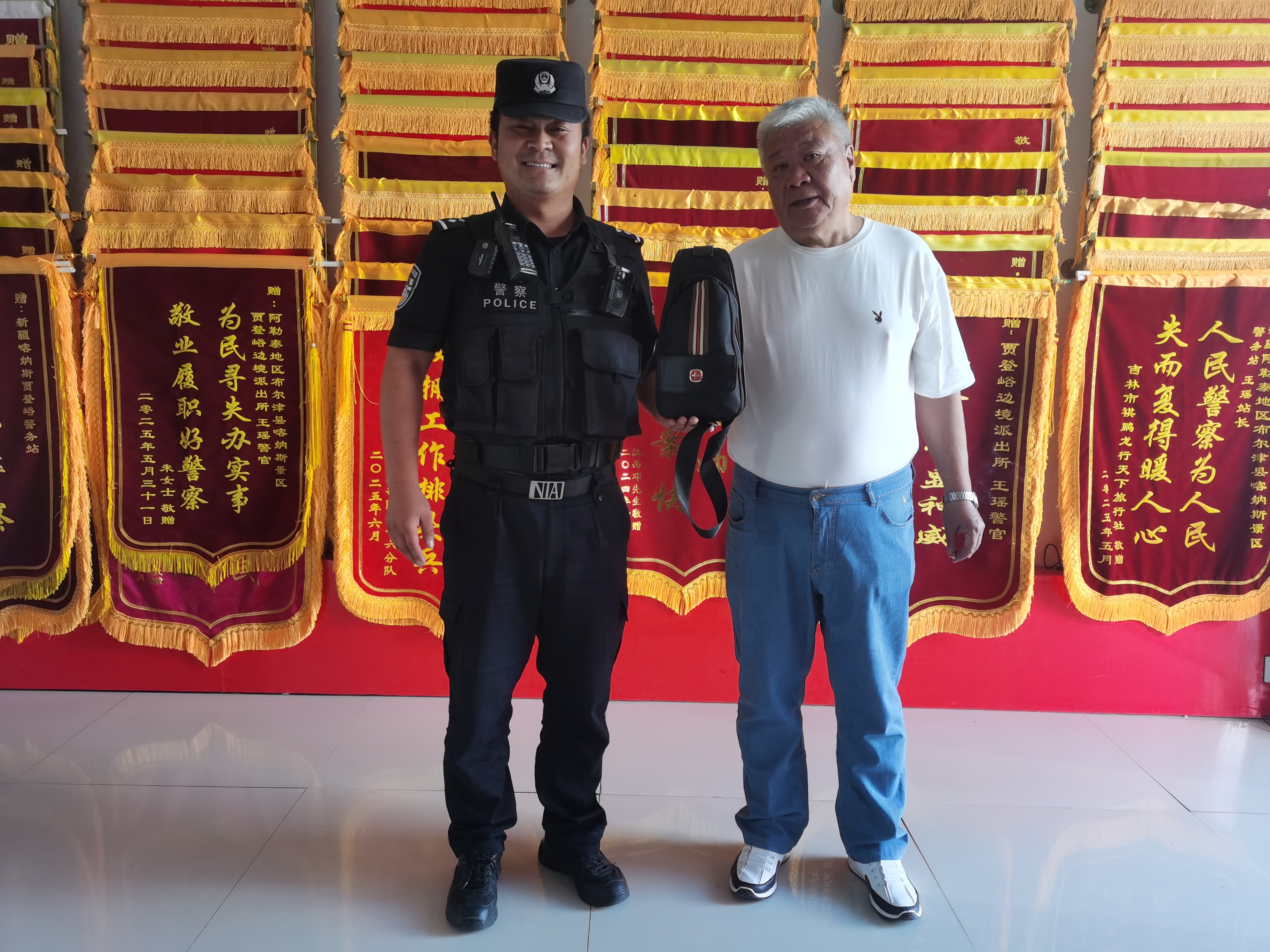 近日,贾登峪边境派出所民警连续高效帮助游客找回遗失的钱包、手机、无人机、背包等物品,以专业服务与暖心态度获游客广泛好评。