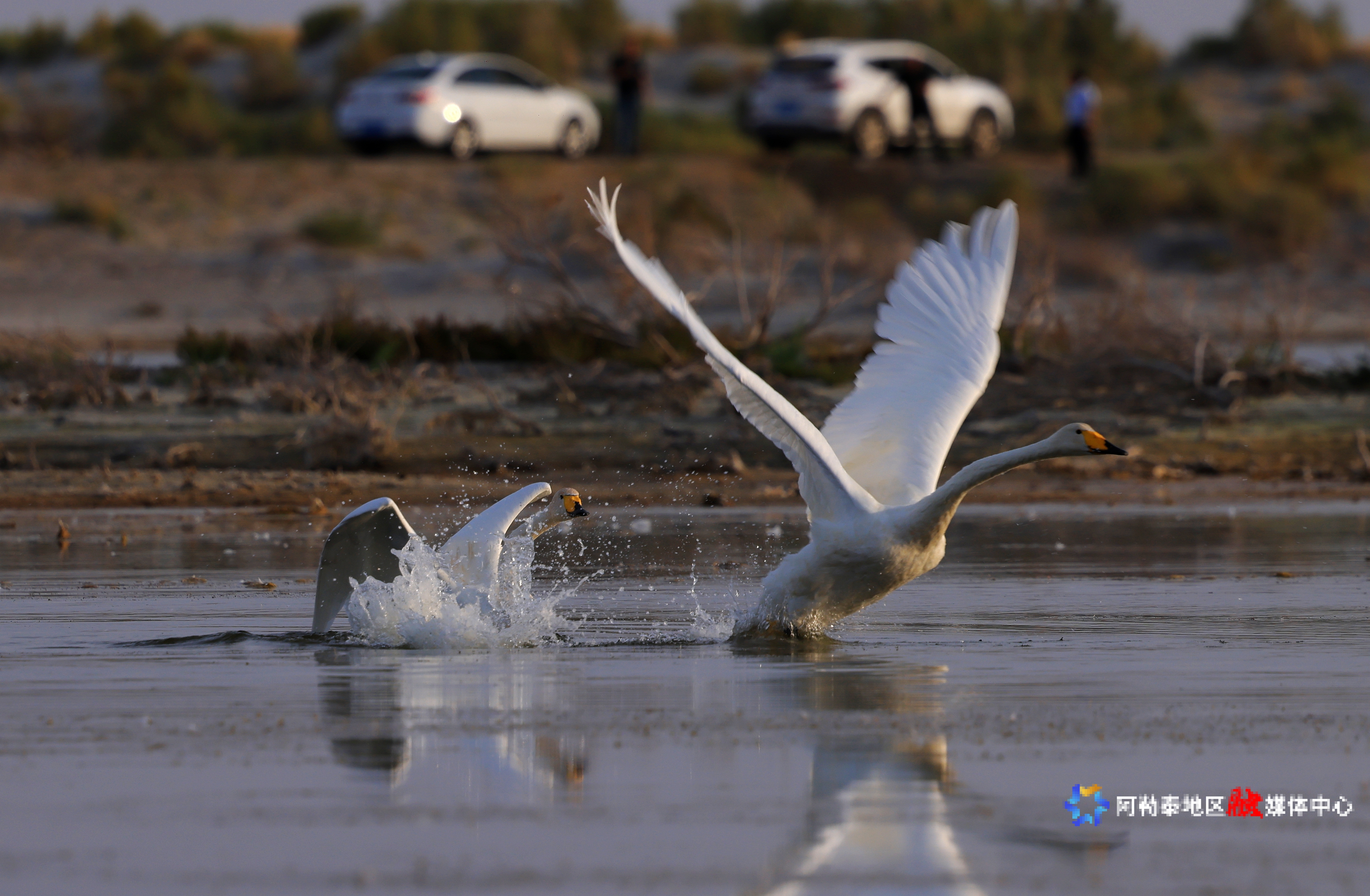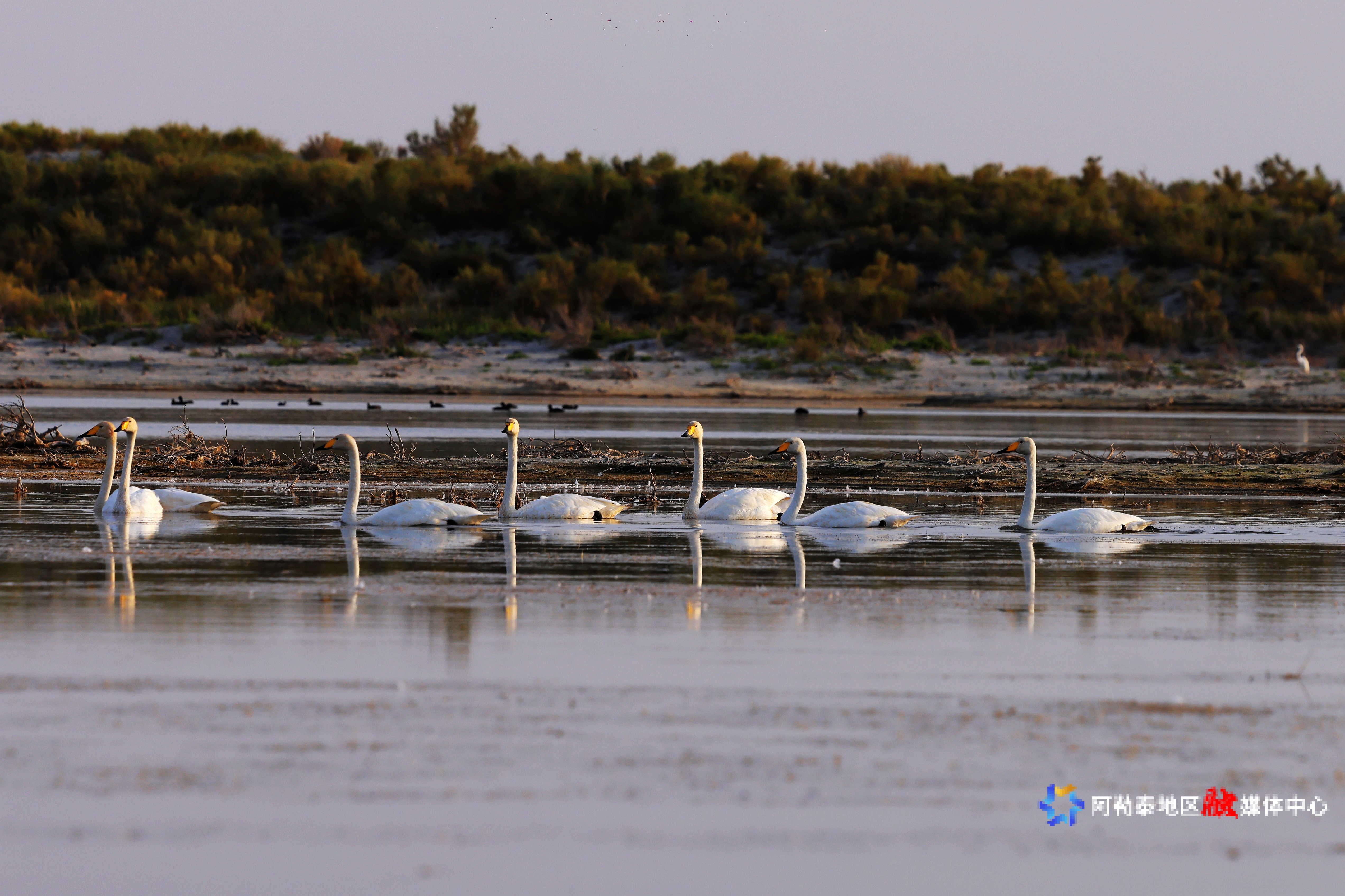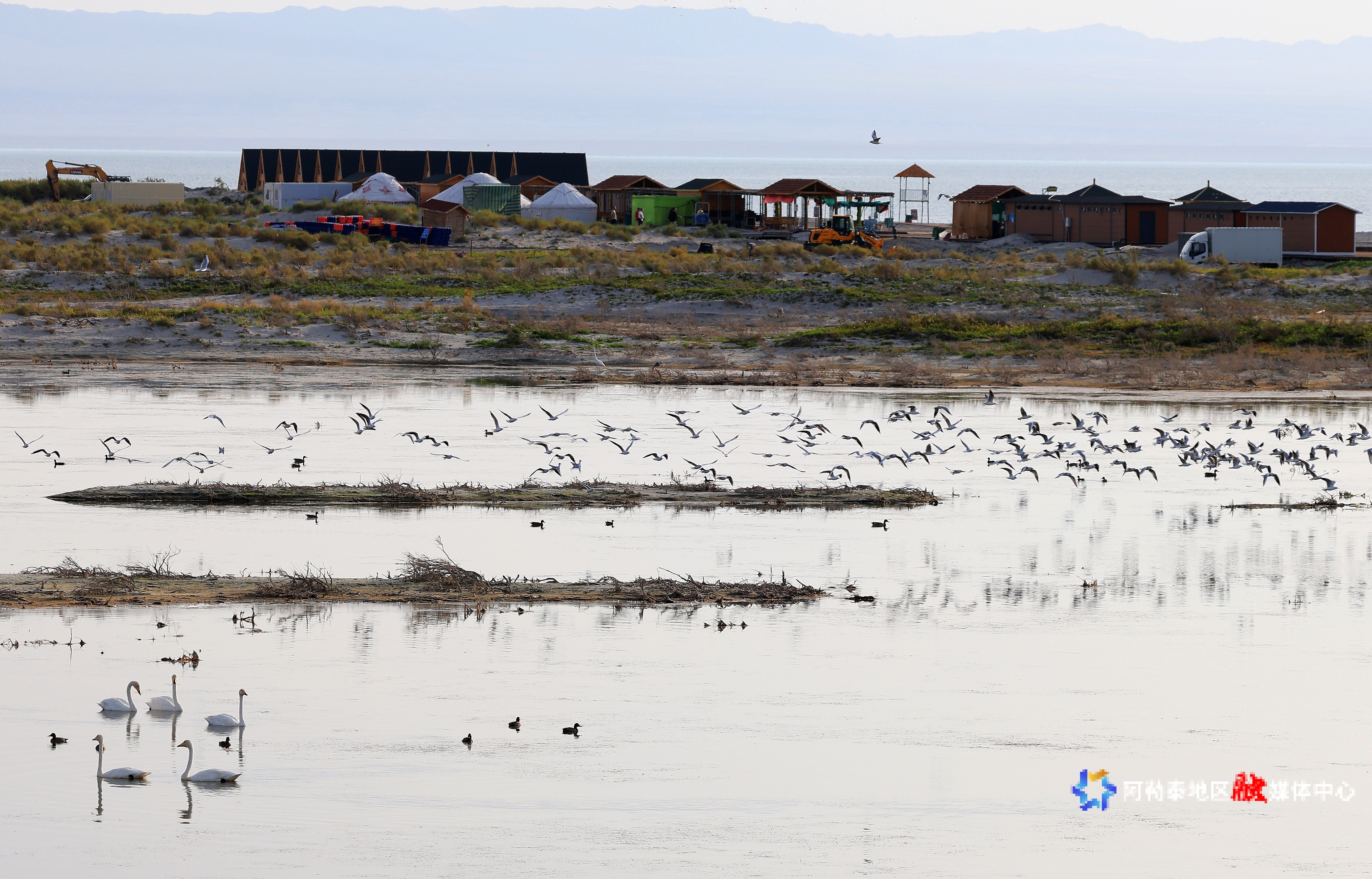 湖面上,成群的天鹅与鸬鹚悠然游弋,时而在水面觅食,时而展翅低飞,为宁静的湖面增添了几分生机。湖畔的沙滩上,骆驼悠闲踱步,与远方的雅丹地貌相映成趣,为游客们提供了多样化的观赏体验。