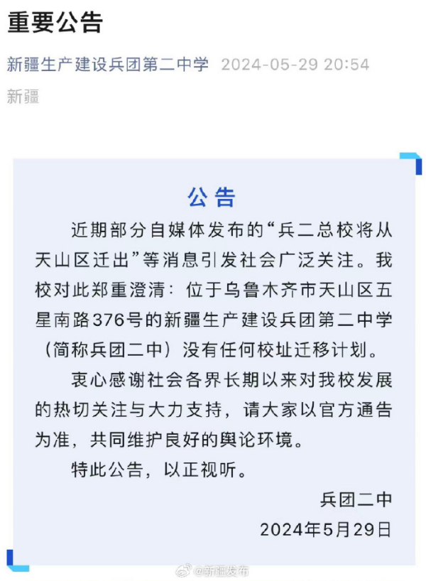 官方辟谣!兵团二中没有任何校址迁移计划