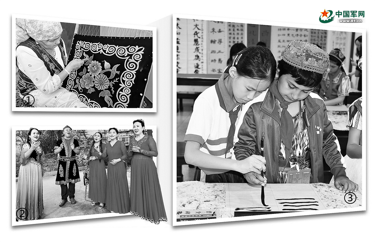 图③:喀什地区青少年交流活动中,汉族儿童和维吾尔族儿童同写书法。喀什地委宣传部供图