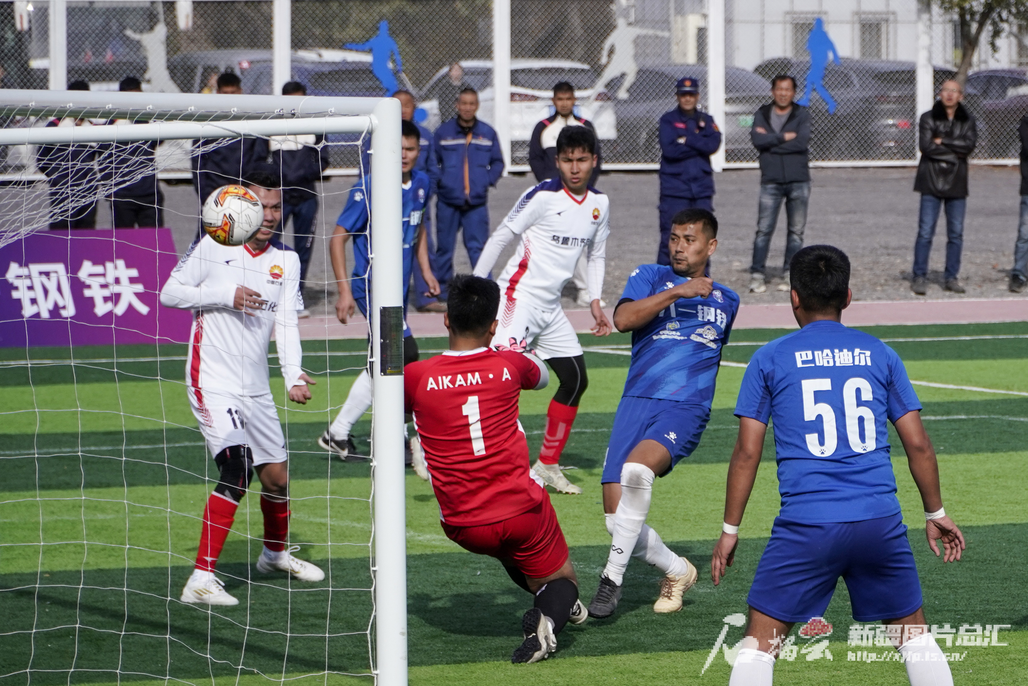 10月19日,新疆“工会杯”2024年度职工运动会足球比赛乙组决赛中,中国石油乌鲁木齐石化公司工会足球代表队守门员奋力扑救。石榴云/新疆日报记者 杨伟摄