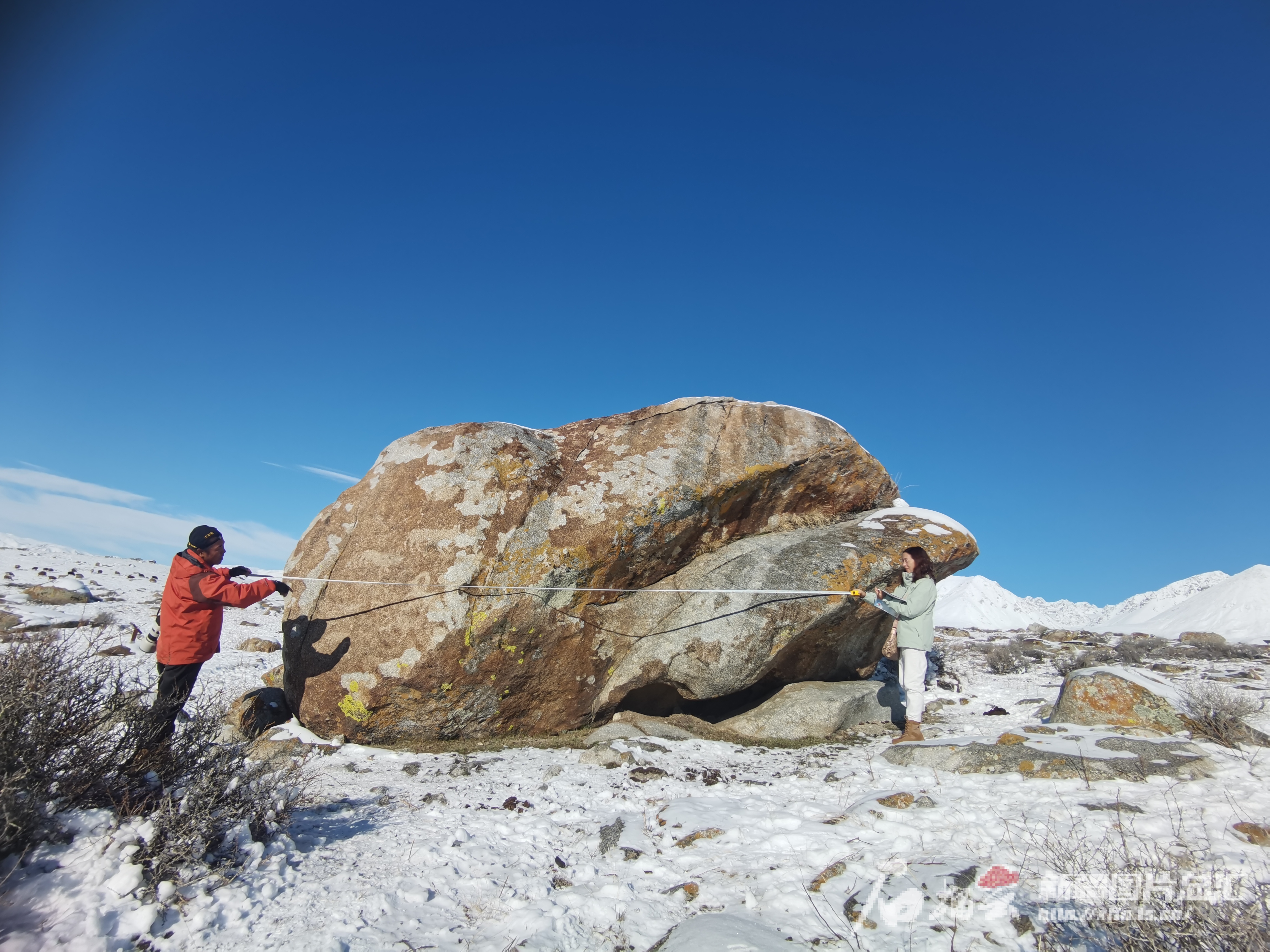 10月18日,尚国军(左)和朱平(右)一起在测量岩画的体积。天山网-新疆日报记者 白素君 摄