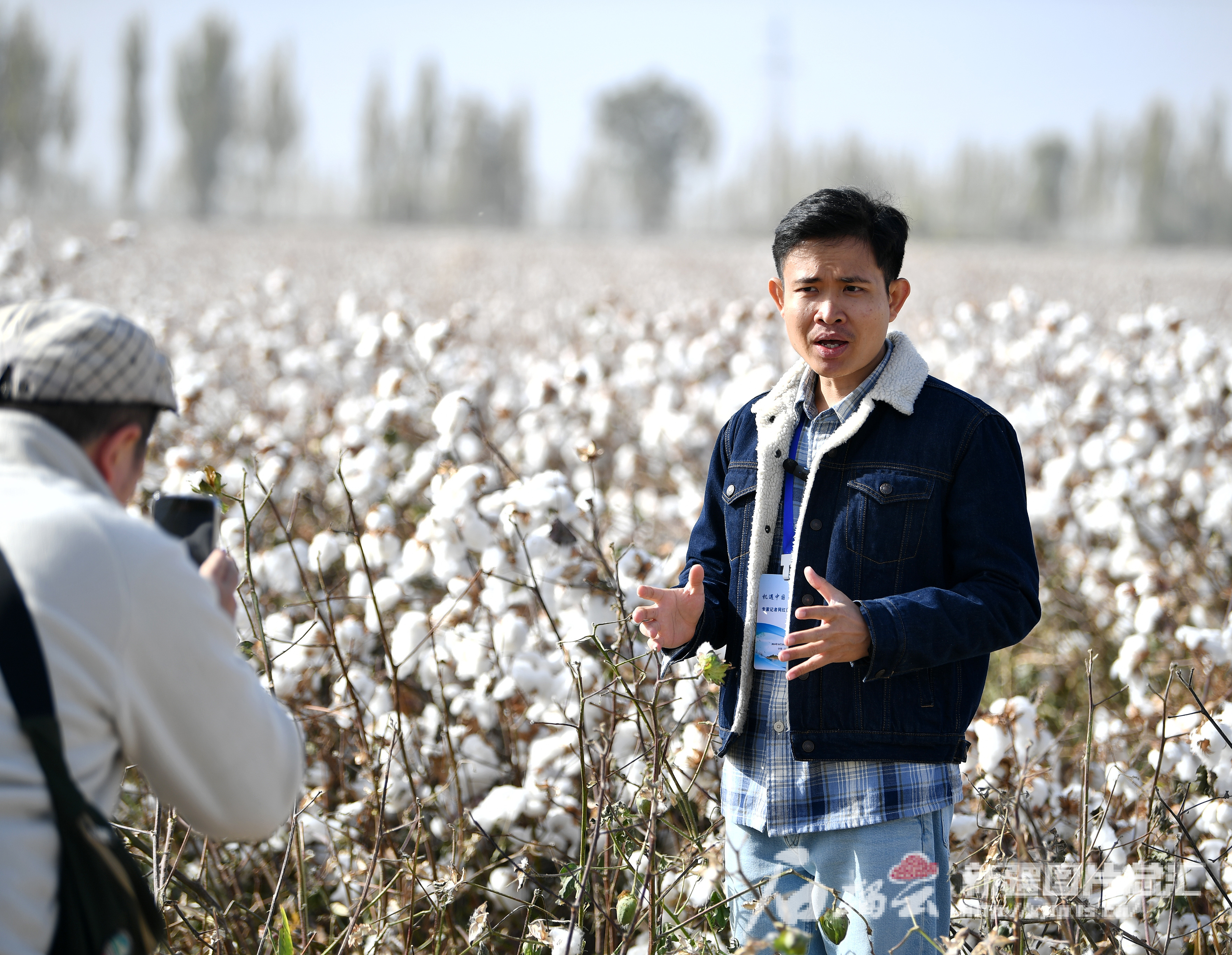10月21日,中国外文局欧亚中心俄罗斯籍记者爱丽克斯·玻滋达耶娃(中)在采访棉农。