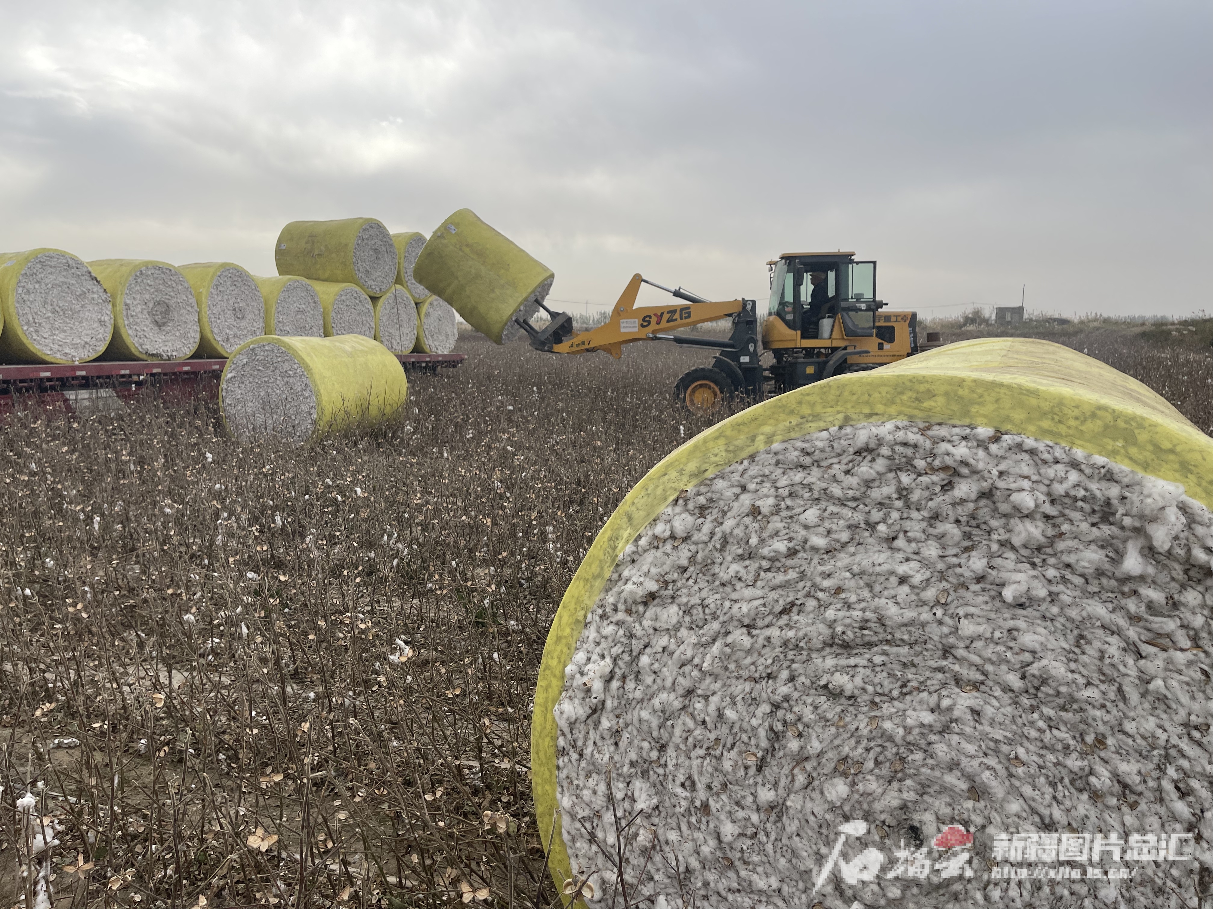 10月24日,在阿瓦提县一处棉田,装载机将打包好的棉花装车。