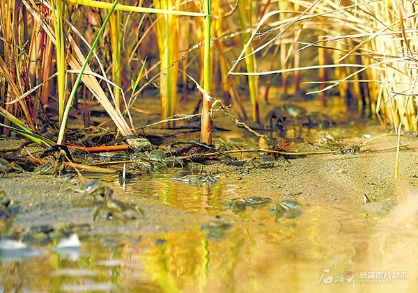 10月19日,福海县国家现代农业产业园,稻浪翻滚,满目金黄。围田而建的蟹沟里,“稻田蟹”悠闲自在。