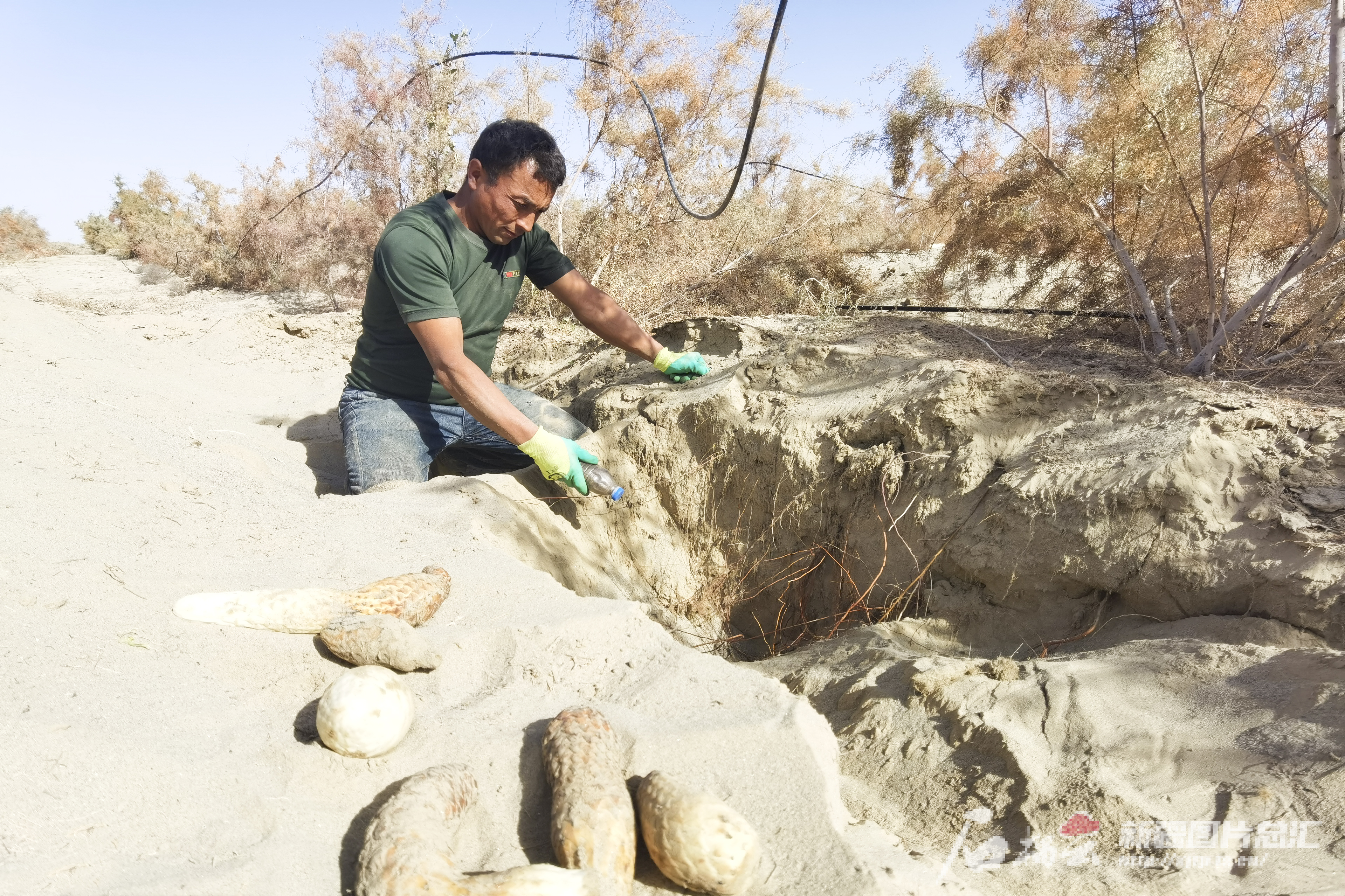 10月31日,和田县迪达尔农民专业合作社的社员在采挖完肉苁蓉后补种种子。