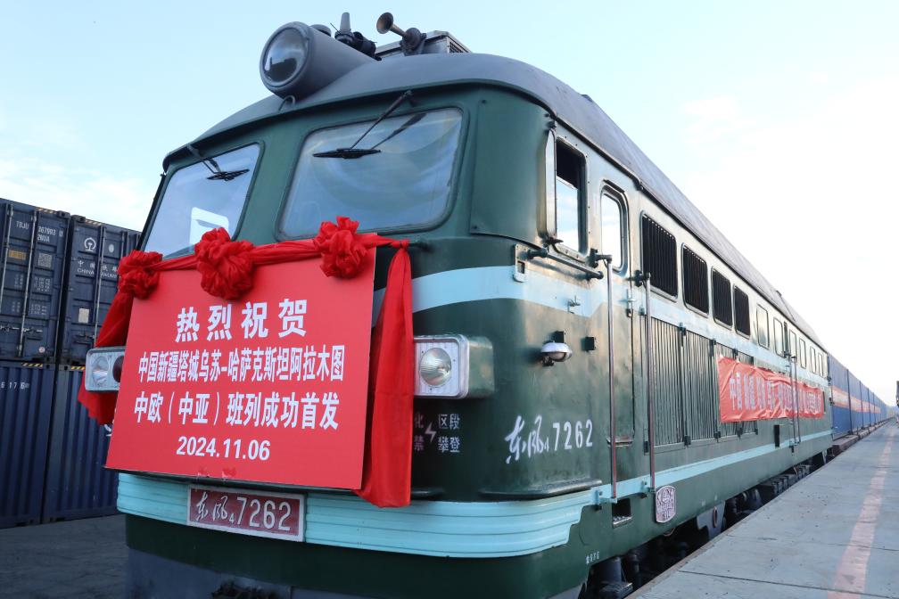 11月6日,在新疆塔城地区乌苏铁路货场,中国新疆塔城乌苏—哈萨克斯坦阿拉木图中欧(中亚)班列首发。新华社发 (唐志阳 摄)