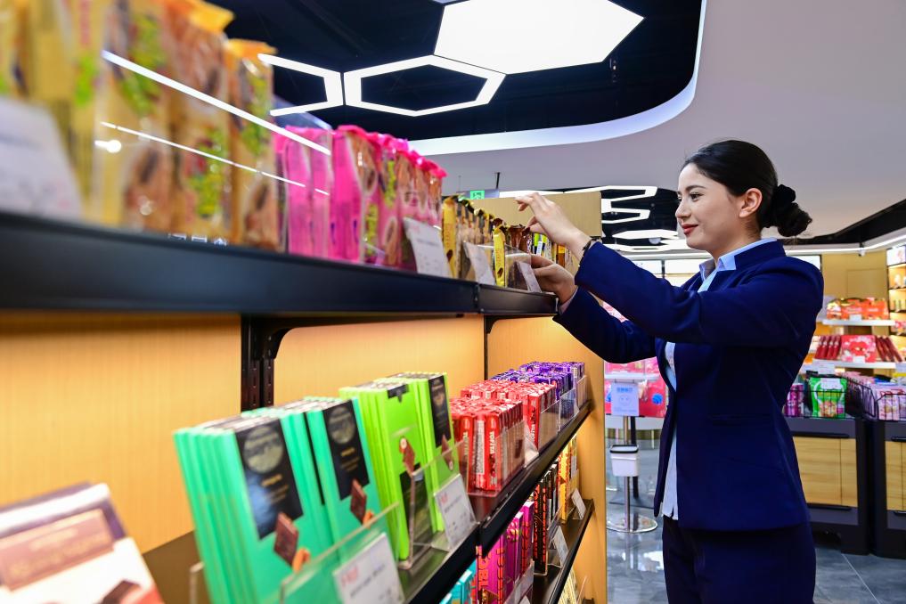 11月5日,在位于新疆乌鲁木齐市的美林购进口保税商品体验中心,工作人员在整理货架。新华社记者 丁磊 摄