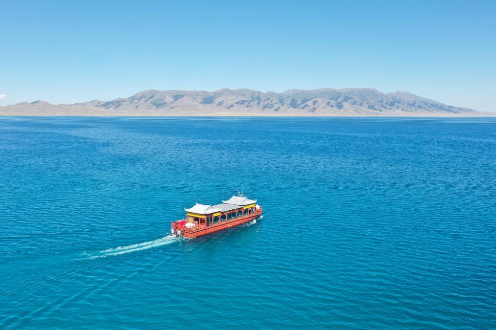 2023年7月25日,游客乘坐游船在新疆赛里木湖游览(无人机照片)。新华社记者 丁磊 摄
