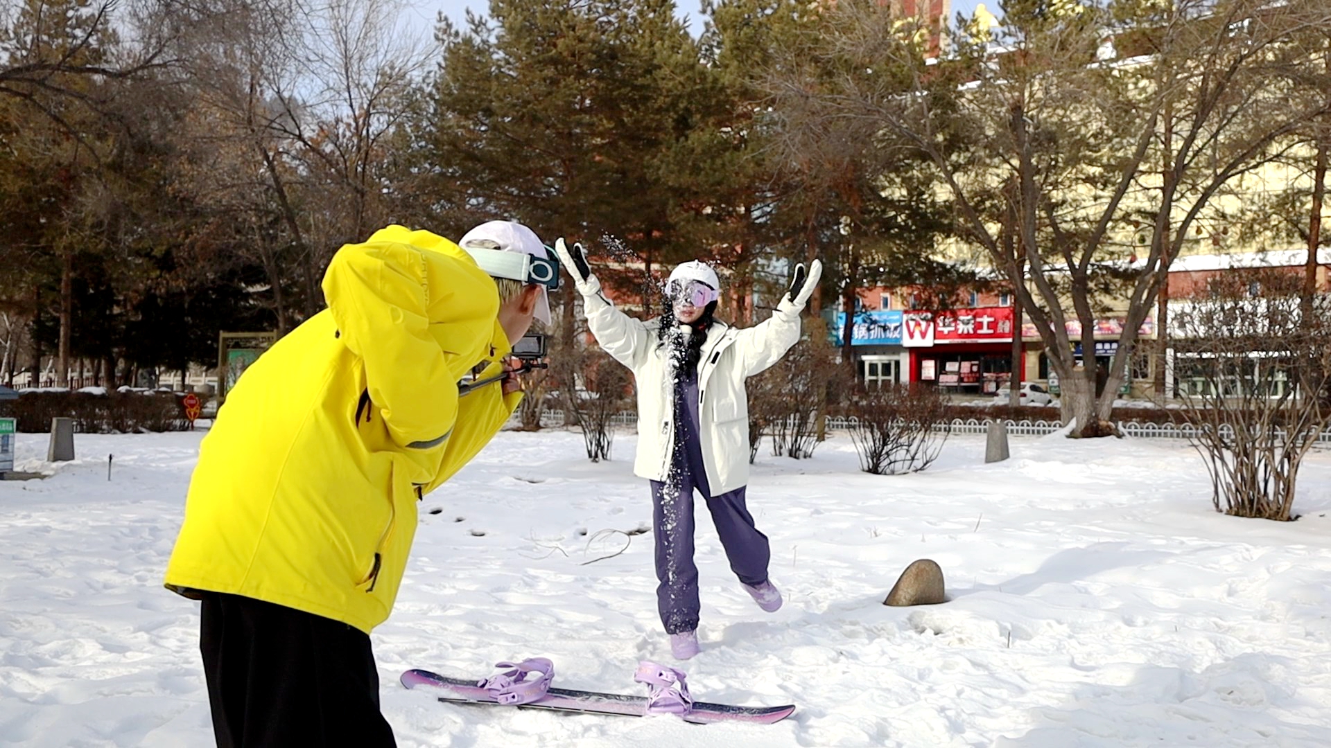 12月4日,在阿勒泰市区,摄影爱好者杨家珺正在为雪友拍照,他的作品在网络上广受欢迎。