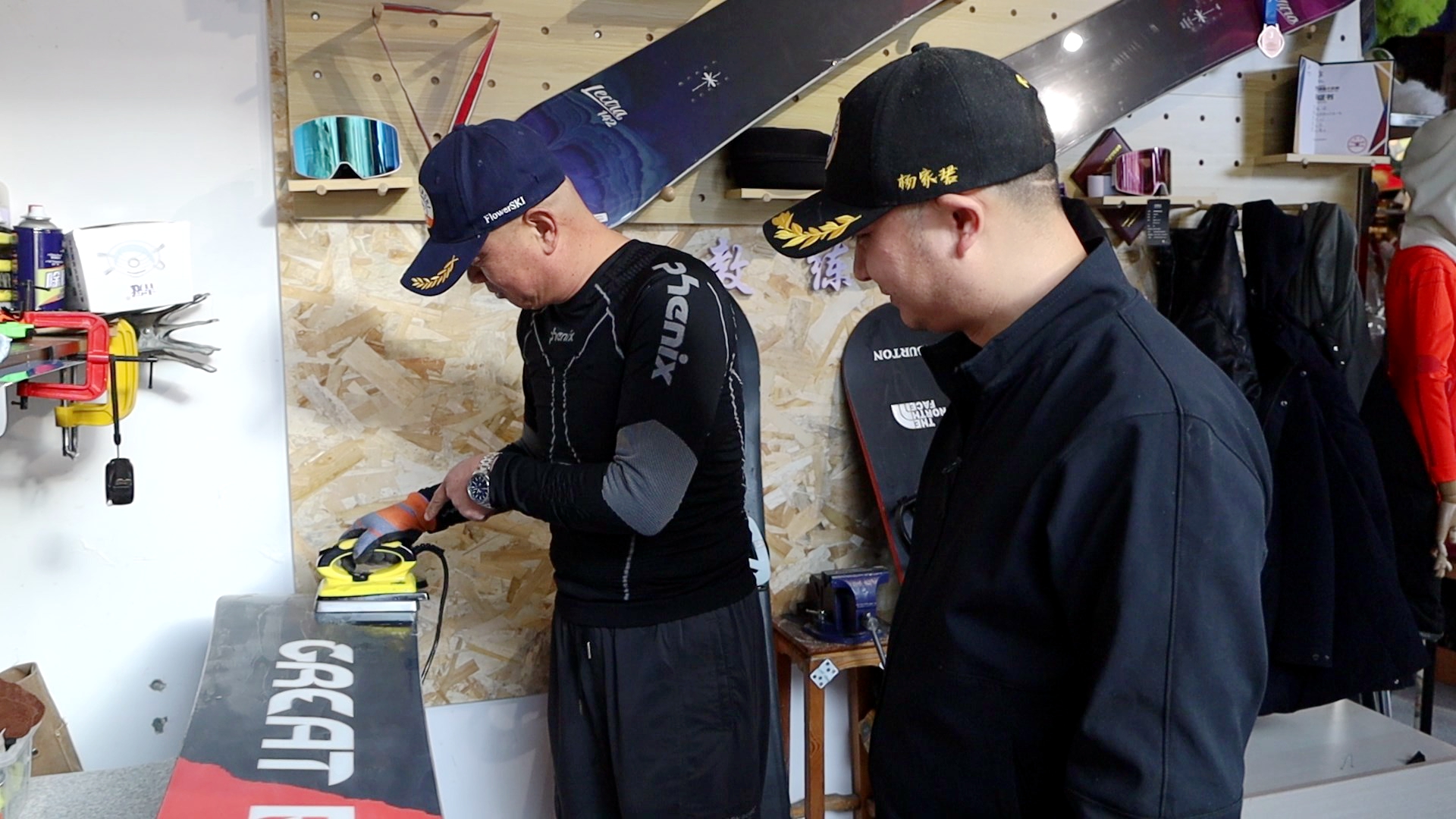 12月4日,松疆雪具店的雪具维修师正在为学徒传授维护雪板的技巧。