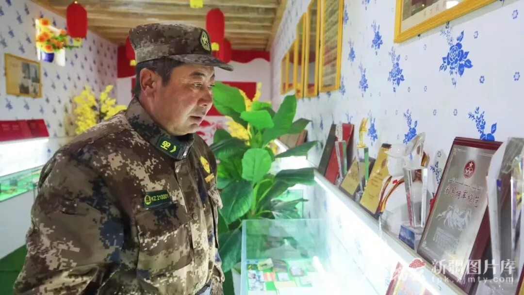 如今,吐尔地家的护边队伍壮大了。妻子托仑·买买提卡德尔和儿子阿迪别克·吐尔地都穿上了护边员制服。小女儿阿依美热木·吐尔地成了家庭博物馆的解说员,向参观者讲述祖辈用过的马鞍、磨破的靴子。2022年父亲去世后,吐尔地把老人的照片挂在博物馆正中央。他常对儿子说:“如果有一天我不在了,你们要接着走我巡边的路。”