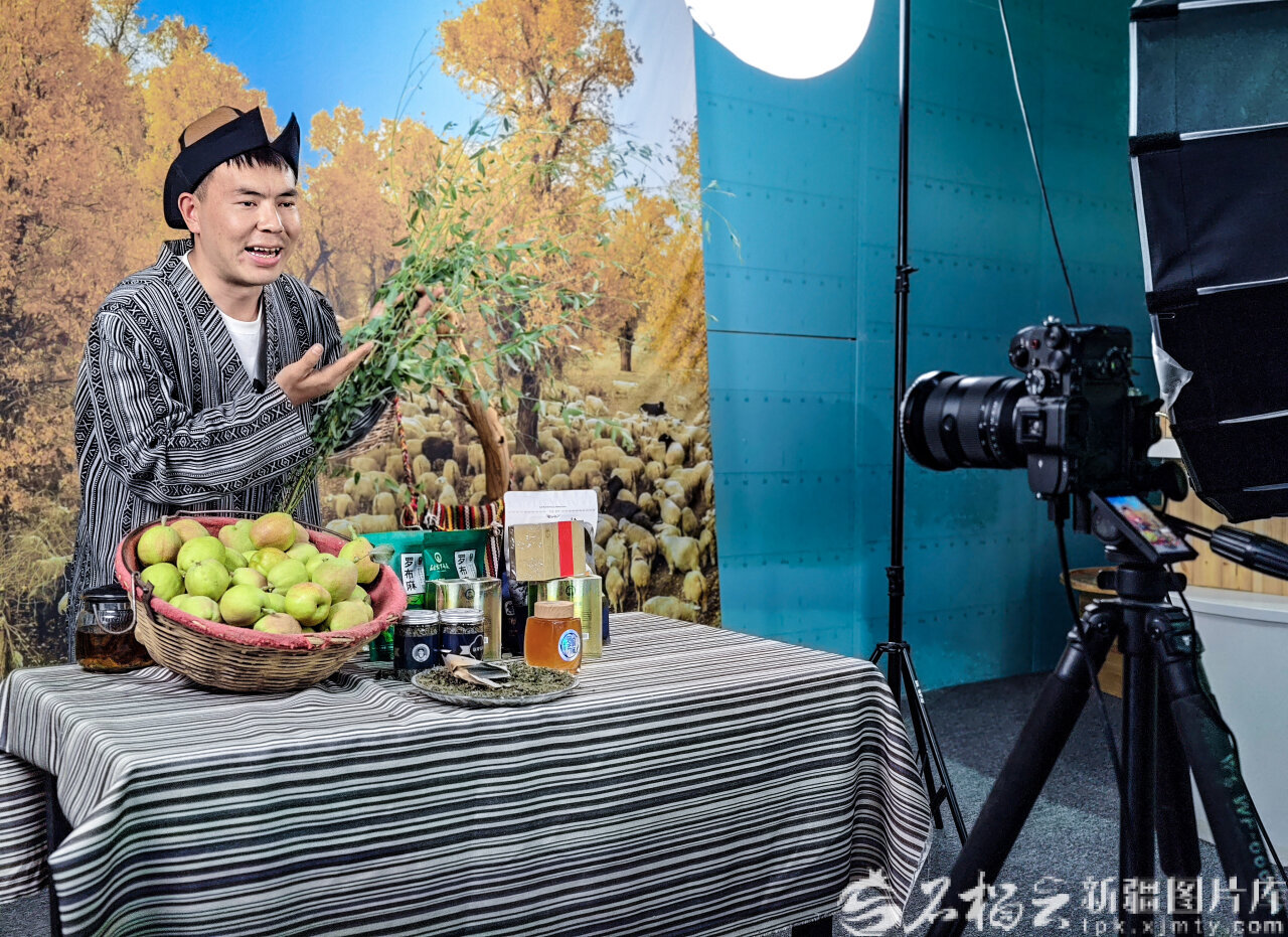 9月9日,村民在尉犁县兴平镇达西村直播基地,直播销售该村出产的农副产品。