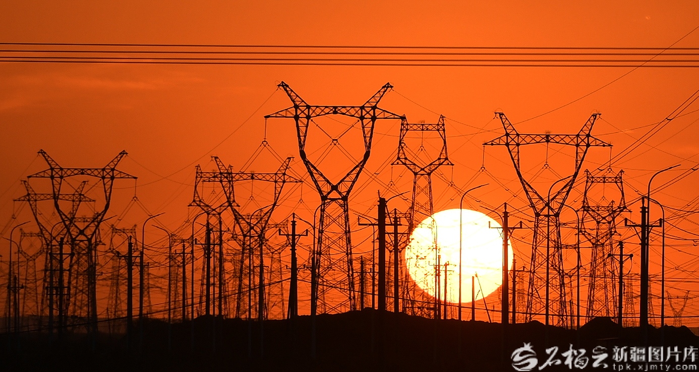 9月9日,夕阳下昌吉—古泉±1100千伏特高压直流输电工程昌吉换流站外的输电线路。