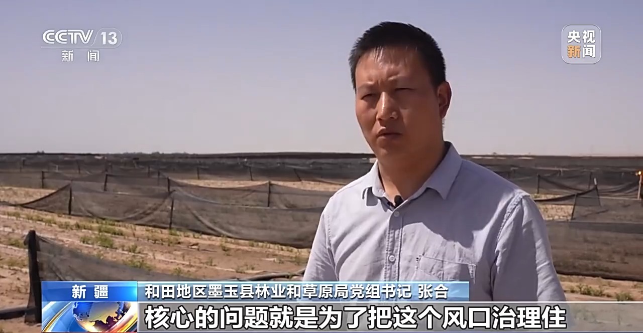 和田地区墨玉县林业和草原局党组书记 张合:我们选择这块区域锁边加厚,核心的问题就是为了把这个风口治理住,减少风沙对绿洲内部的侵蚀。