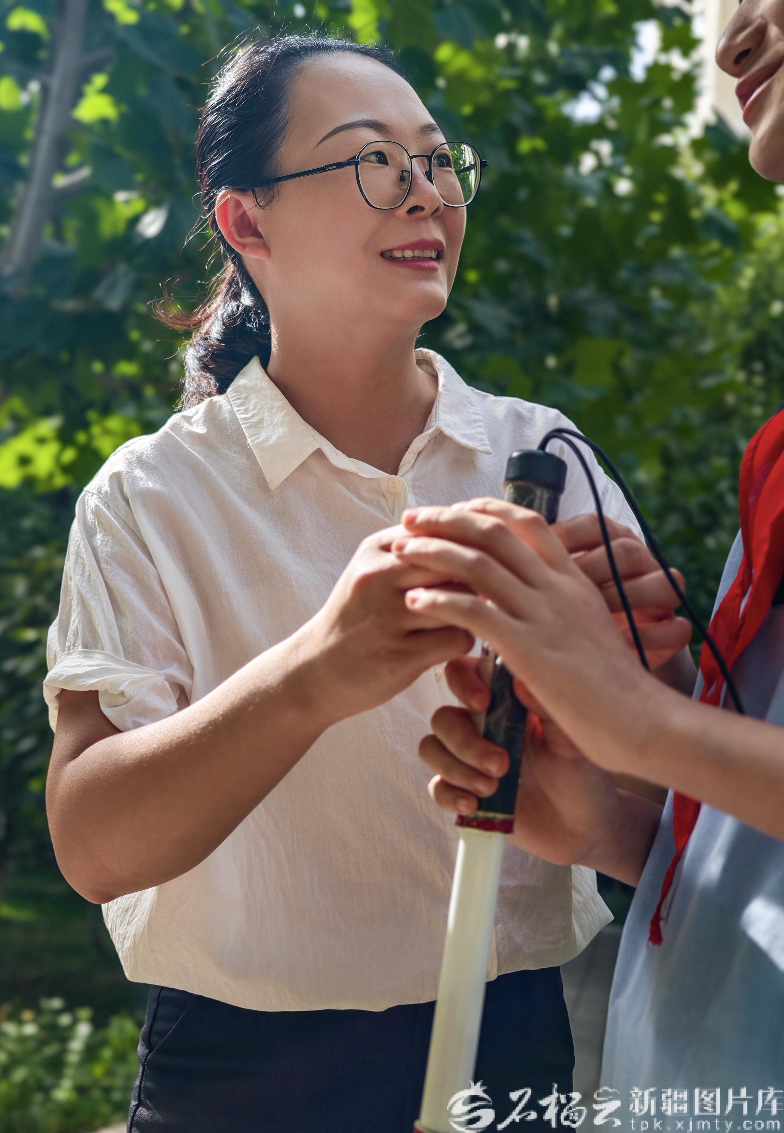 9月11日,一名老师正在指导盲人学生使用手杖走路。