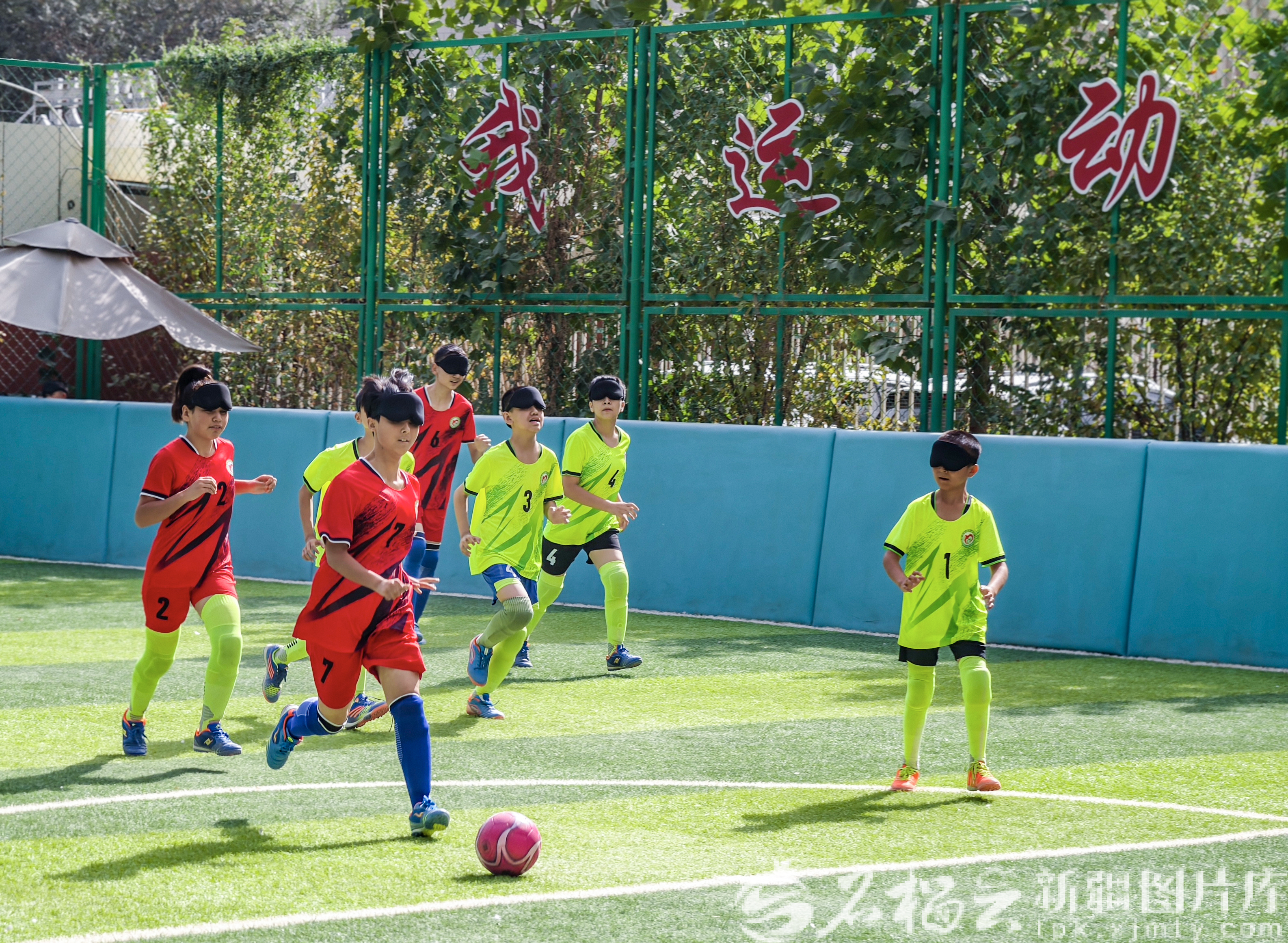 9月11日,盲人学生听声音指引进行足球比赛。