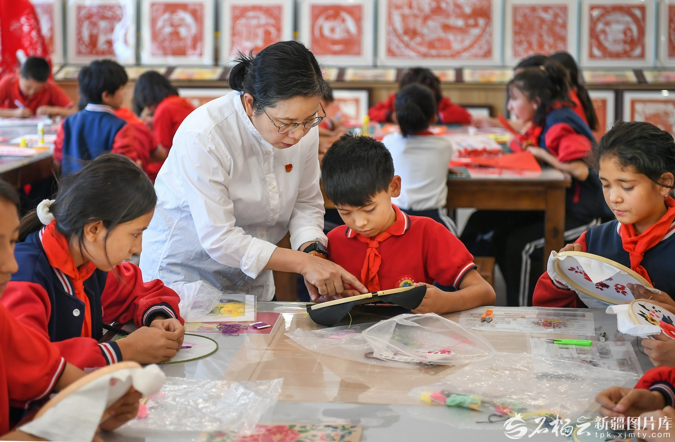 9月19日,疏附县托克扎克镇中心小学学生在援疆教师的指导下学习刺绣。