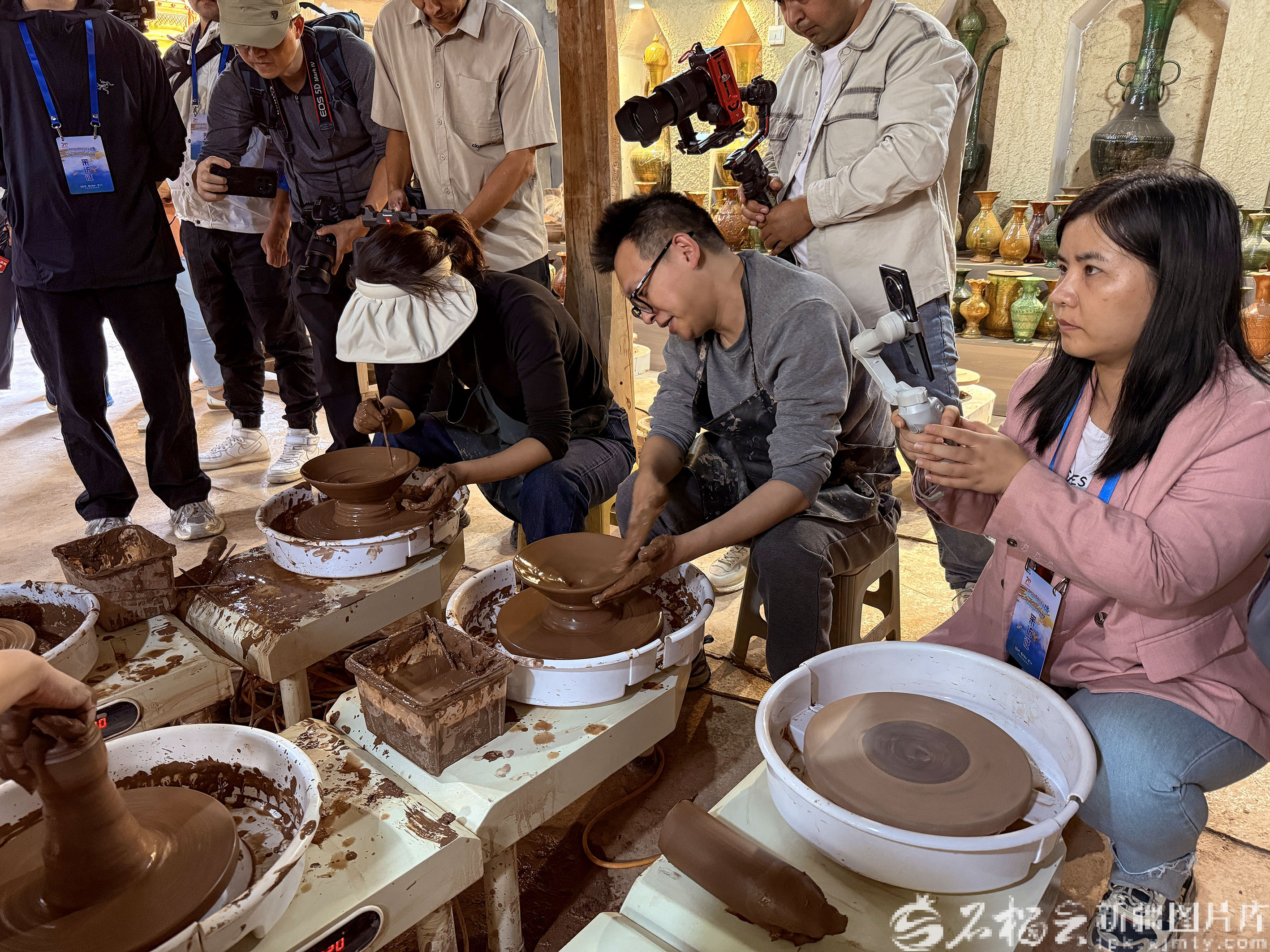 9月19日,安徽新媒体集团记者李晓露(右一)在英吉沙县土陶村采访游客体验制作土陶过程。天山网-新疆日报记者 约提克尔·尼加提摄