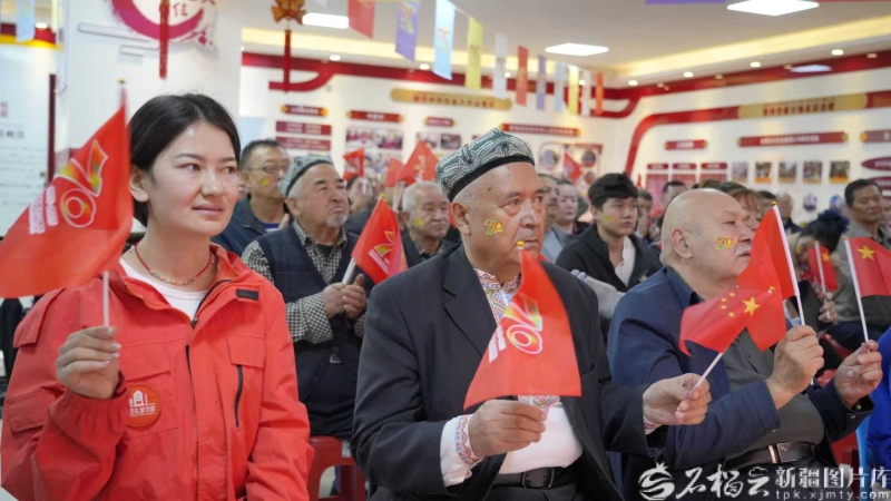 9月25日,在乌鲁木齐市天山区二道桥街道固原巷社区活动室,各族干部群众收看庆祝大会盛况。努尔艾力·图尔荪摄